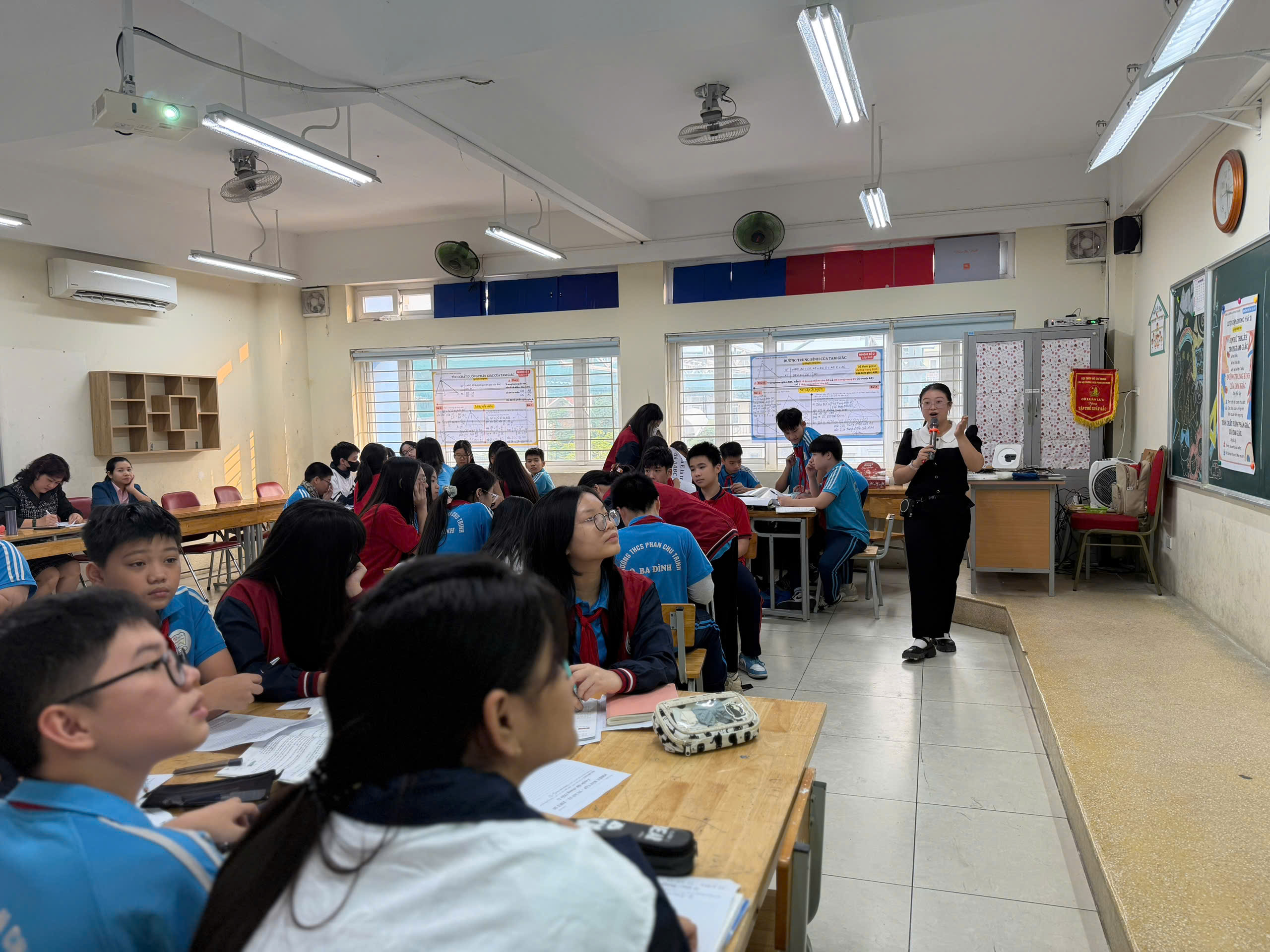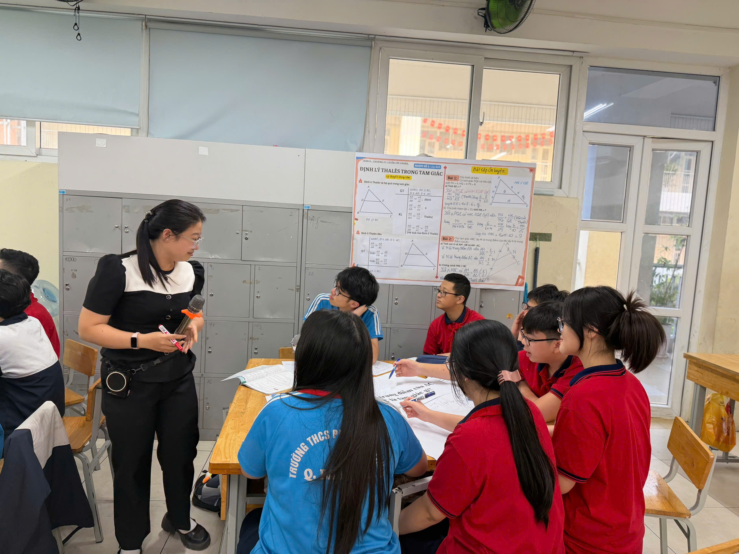 Tiết dạy “Luyện tập chung: Định lí Thalès trong tam giác – Đường trung bình của tam giác – Tính chất đường phân giác”, do cô Thúy Vy thực hiện, là một minh chứng nổi bật cho việc kết hợp nhuần nhuyễn giữa lí thuyết, luyện tập nhóm và bài toán thực tế, từ đó phát triển năng lực giải quyết vấn đề của học sinh. Tiết học được thiết kế theo hướng “hoạt động hóa người học”, chia học sinh thành 5 nhóm chuyên đề tương ứng với từng mảng kiến thức và mức độ vận dụng. Nhóm 1 được giao nhiệm vụ: nêu lại phát biểu định lí Thalès và định lí đảo; chỉ rõ các hệ quả áp dụng trong các bài toán tỉ lệ, chia đoạn thẳng, chứng minh song song và giải thích bằng hình ảnh minh họa trực quan. Giáo viên đã khéo léo sử dụng sơ đồ, hình vẽ trực quan giúp học sinh nhanh chóng kết nối giữa lí thuyết và hình ảnh, nhờ đó hiểu sâu bản chất tỉ số trong tam giác.
