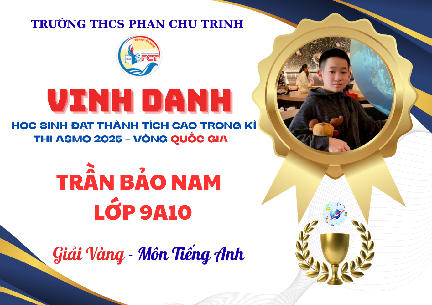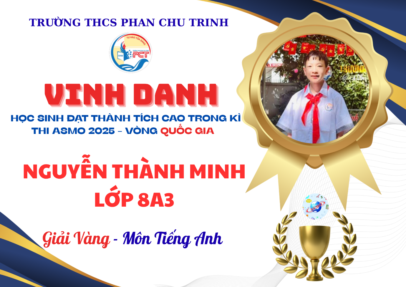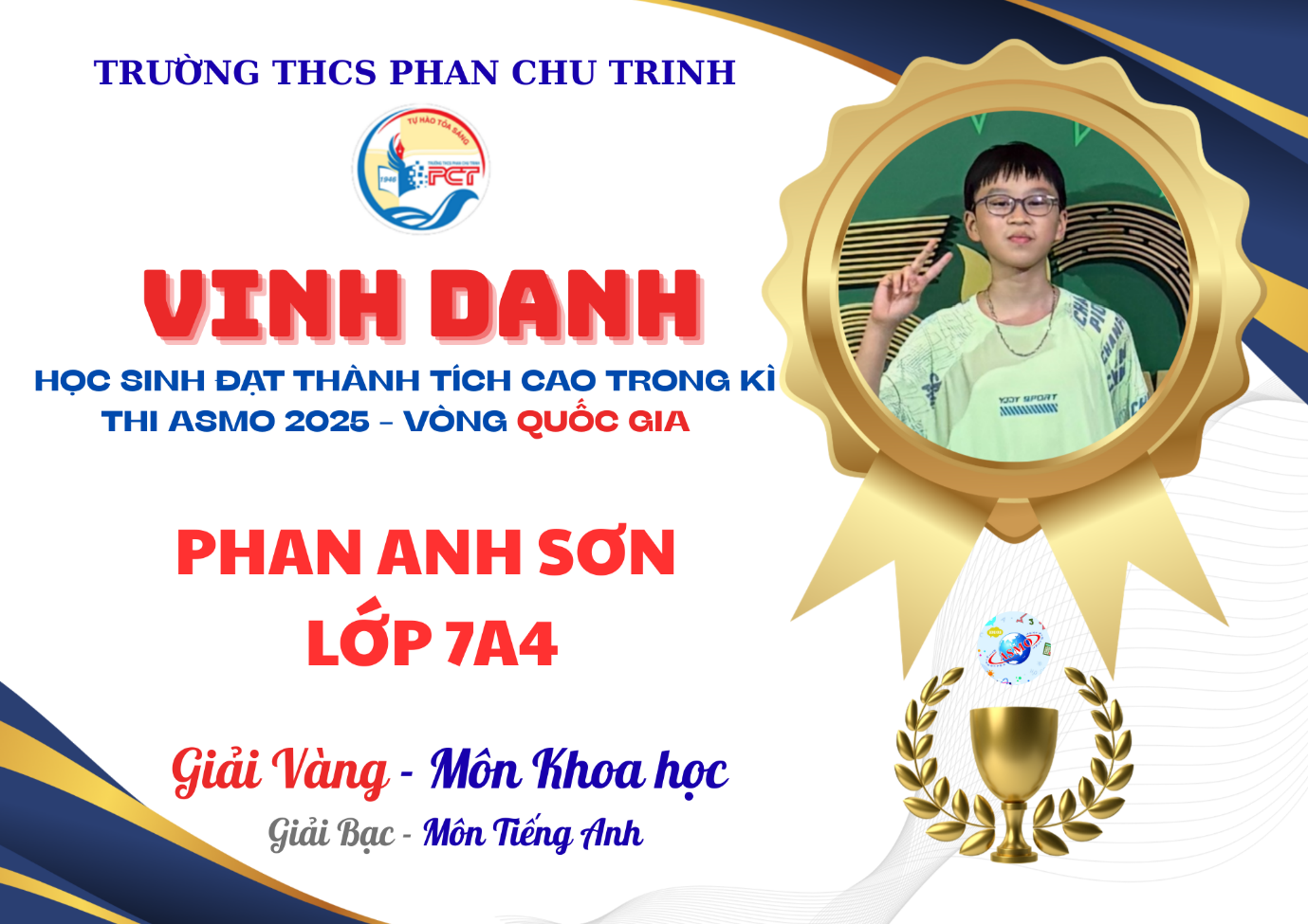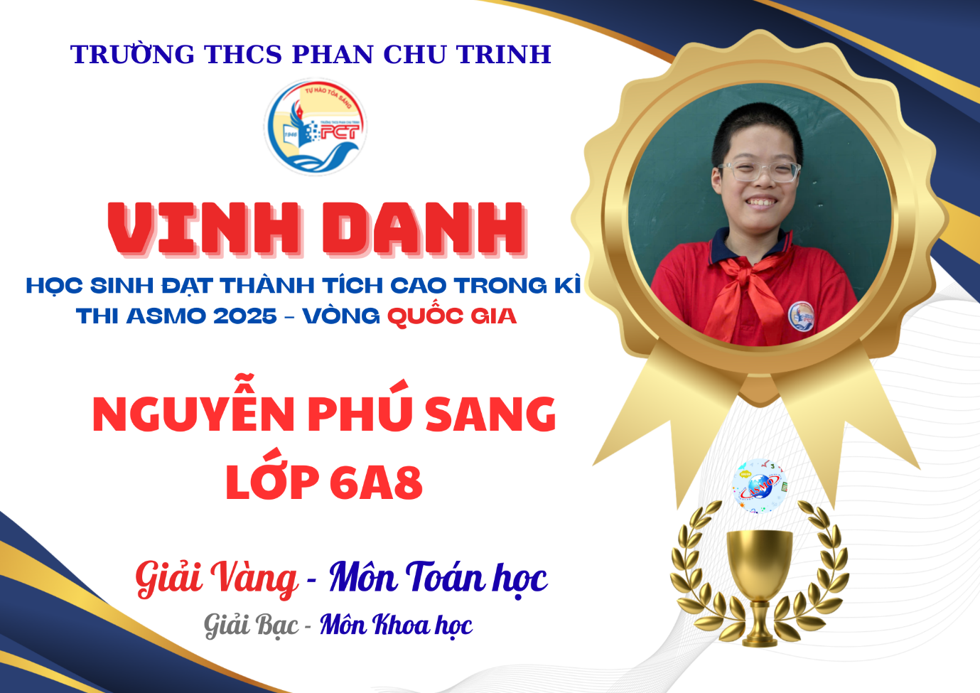 Tại Vòng Quốc gia của cuộc thi Olympiad Toán và Khoa học Châu Á - Asian Science and Maths (ASMO) 2025, Trường THCS Phan Chu Trinh đã ghi nhận thành tích nổi bật với gần 90 lượt học sinh lọt vào vòng trong và tỉ lệ 100% thí sinh đạt giải. Đây được xem là một trong những mùa thi thành công nhất của nhà trường tại sân chơi học thuật tầm cỡ quốc tế này.