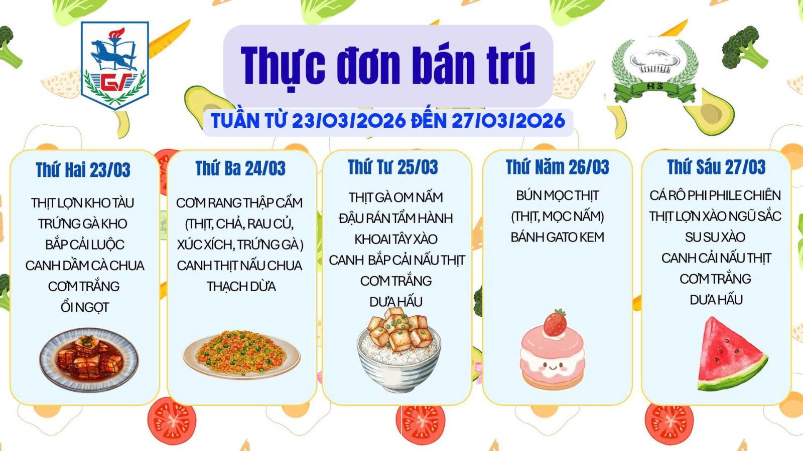 Thực đơn bán trú từ ngày 23/3 đến ngày 26/3/2026