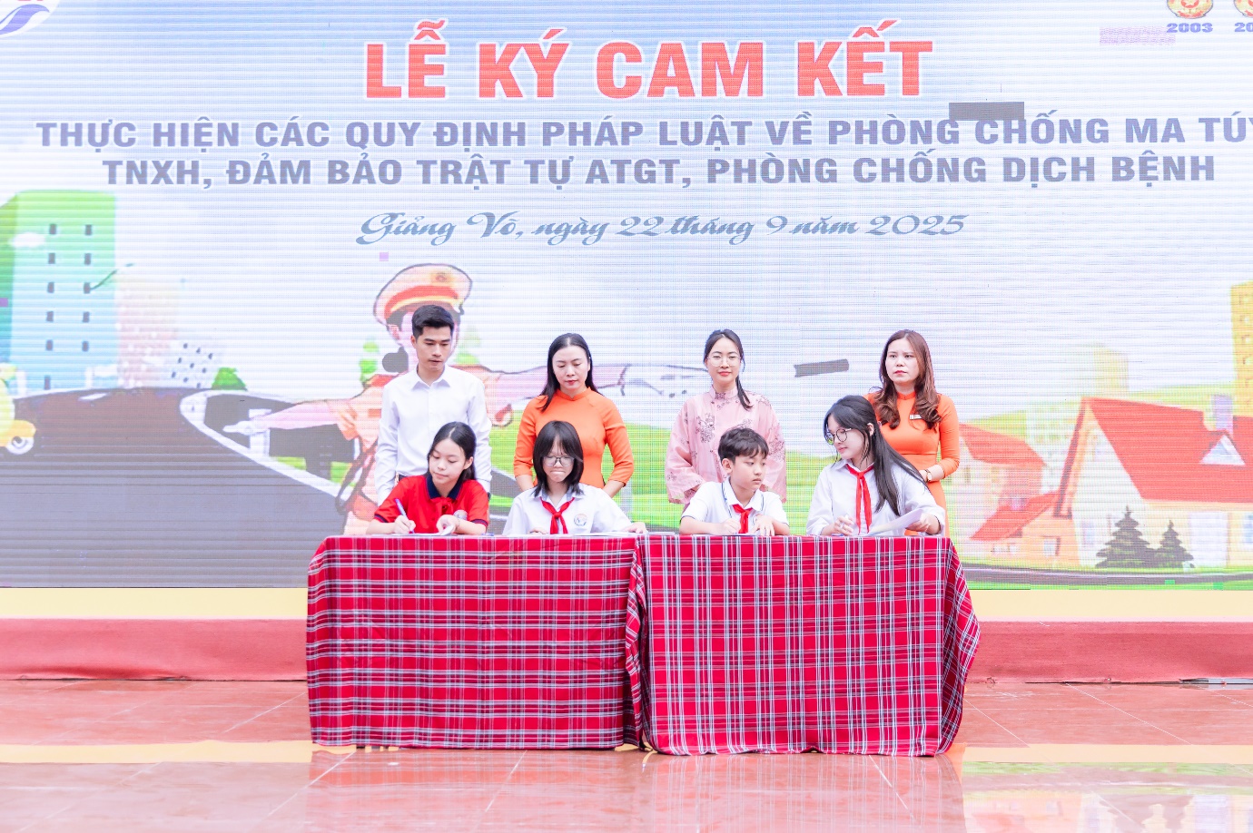 Điểm nhấn của chương trình là phần ký cam kết giữa Đại diện các ban ngành của phường Giảng Võ; đại diện CMHS nhà trường với Ban giám hiệu; đại diện các khối chủ nhiệm và đại diện học sinh toàn trường. Từng chữ ký trên bản cam kết thể hiện sự đồng lòng, quyết tâm của cả tập thể nhà trường, nói không với tệ nạn xã hội, tuân thủ nghiêm Luật giao thông, giữ gìn vệ sinh trường lớp và chủ động phòng chống dịch bệnh.