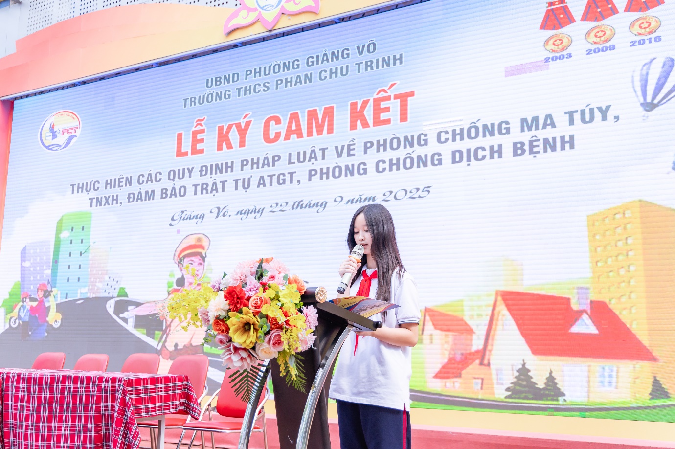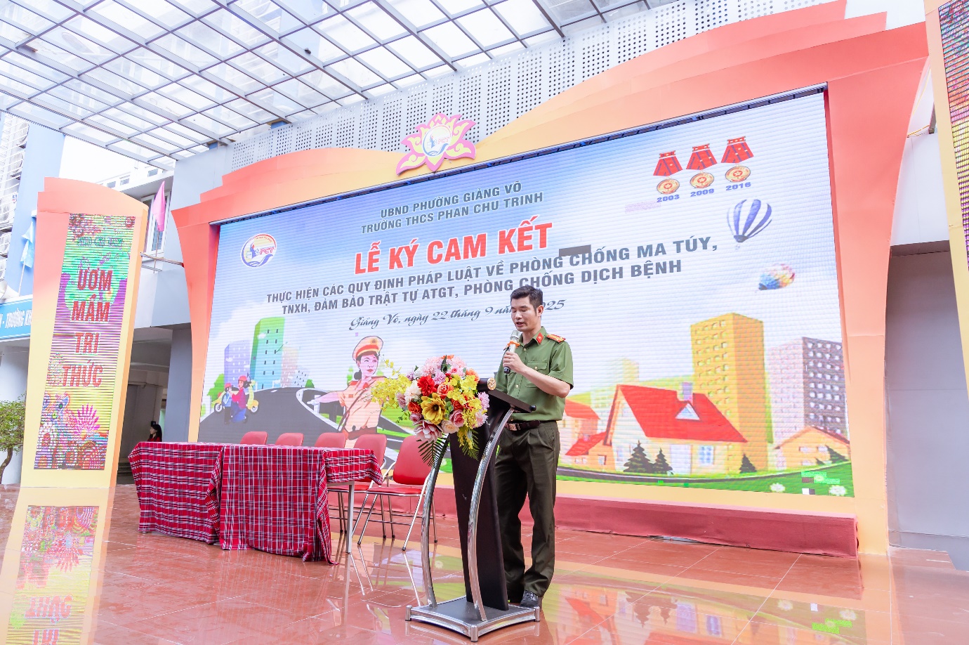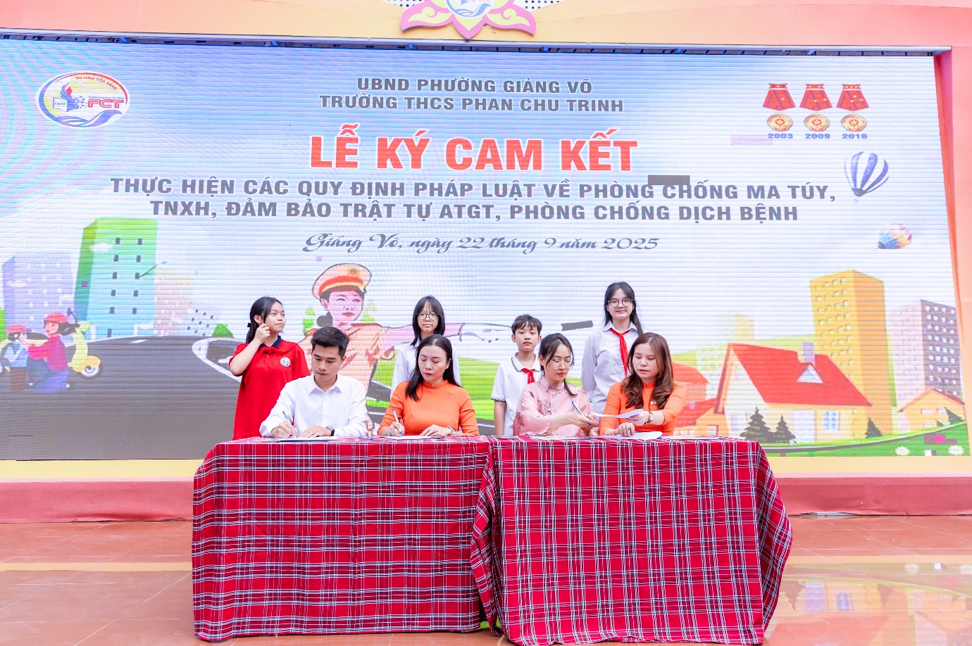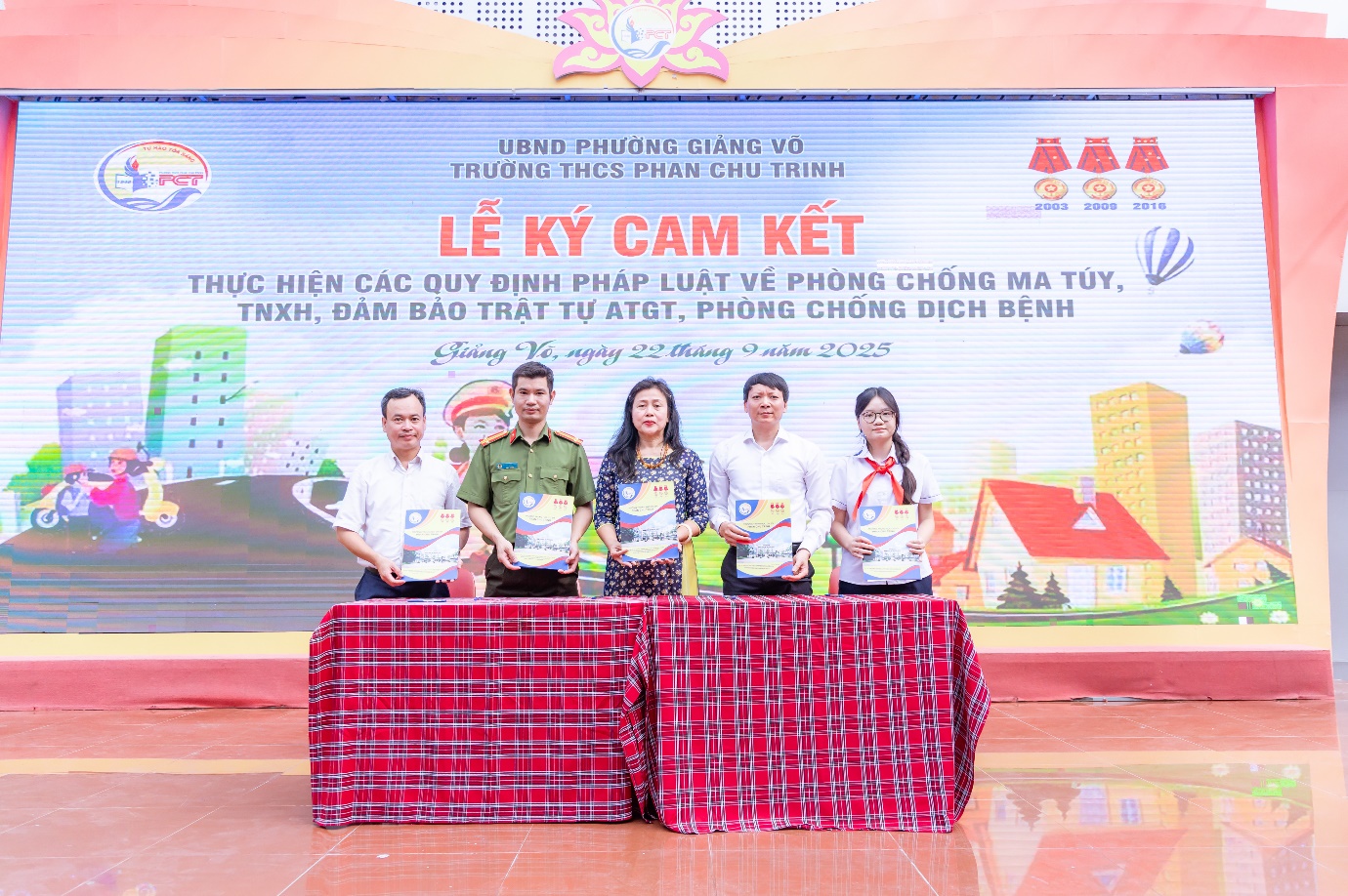 Sáng ngày 22/9/2025, trong không khí phấn khởi của những ngày đầu năm học mới 2025 – 2026, trường THCS Phan Chu Trinh đã long trọng tổ chức Lễ ký cam kết An toàn giao thông và thực hiện nghiêm các quy định pháp luật về phòng, chống tệ nạn xã hội; phòng, chống dịch bệnh trong nhà trường. Tham gia Lễ ký kết có các đồng chí là Trưởng công an phường Giảng Võ; tuyên truyền viên Phòng cảnh sát giao thông Tp.Hà Nội; đại diện Phòng VHXH phường Giảng Võ; đại diện CMHS nhà trường cùng Ban giám hiệu và toàn thể cán bộ, giáo viên, học sinh nhà trường.