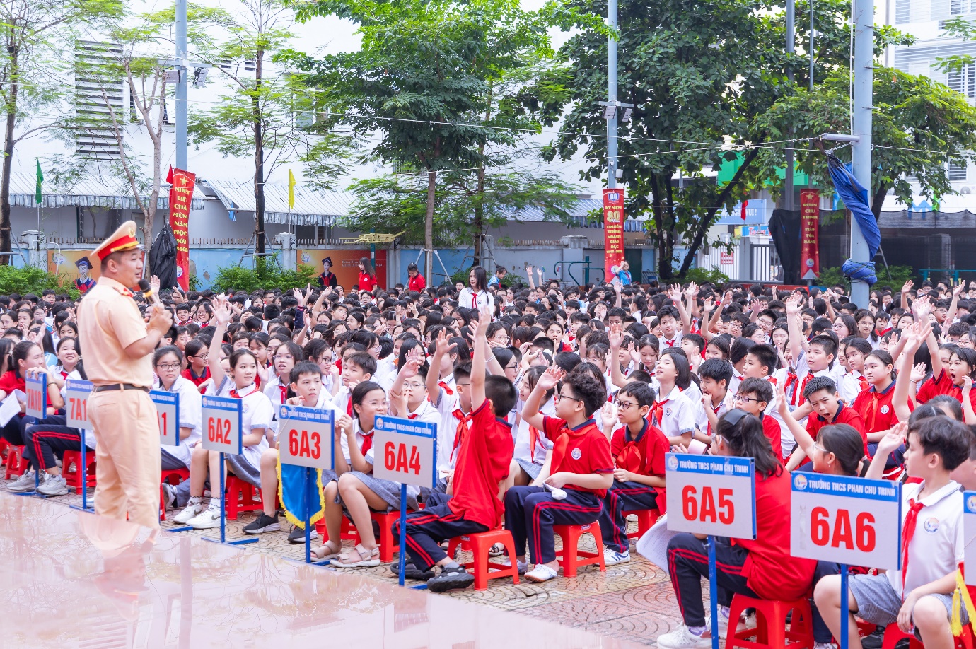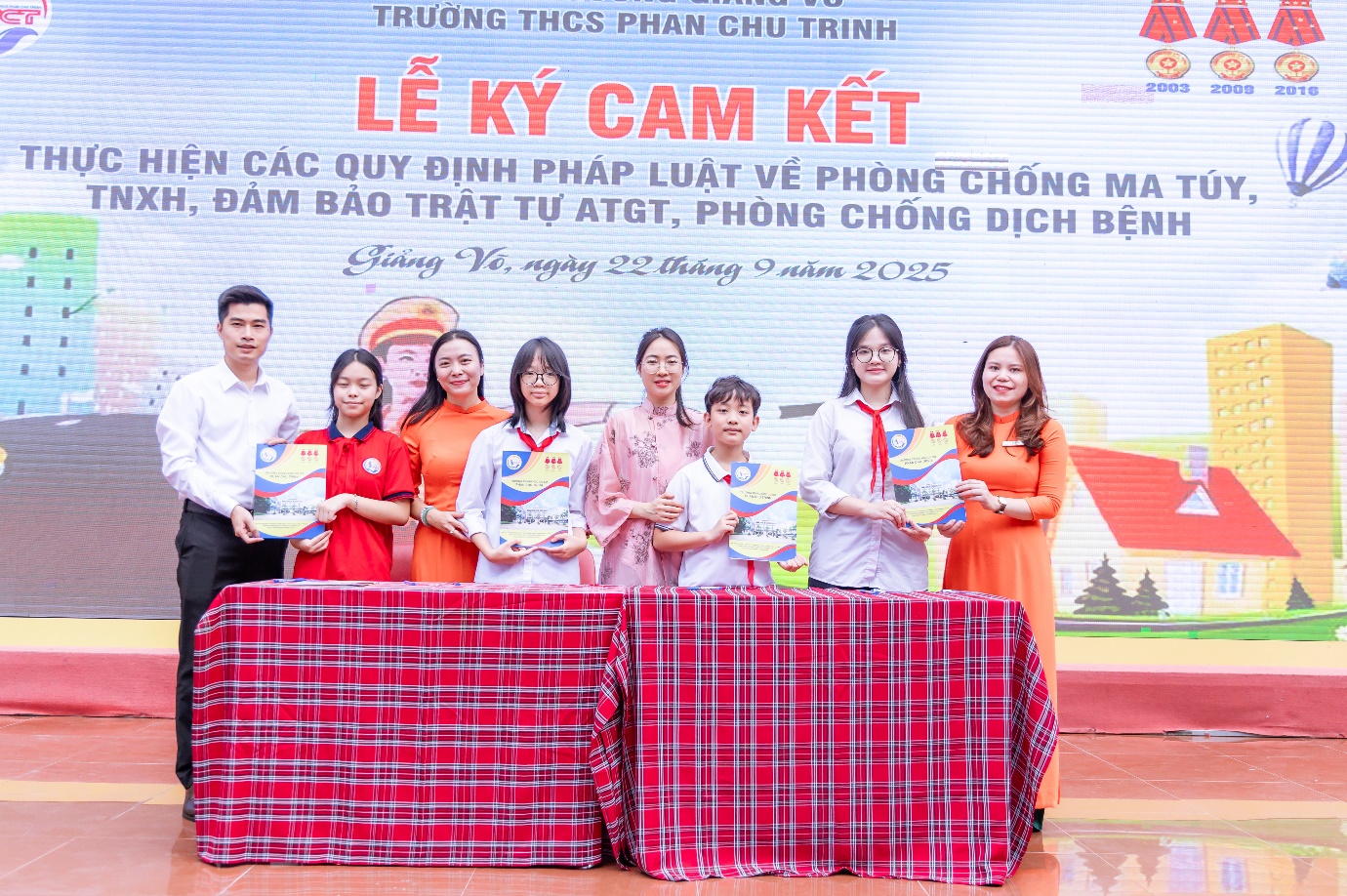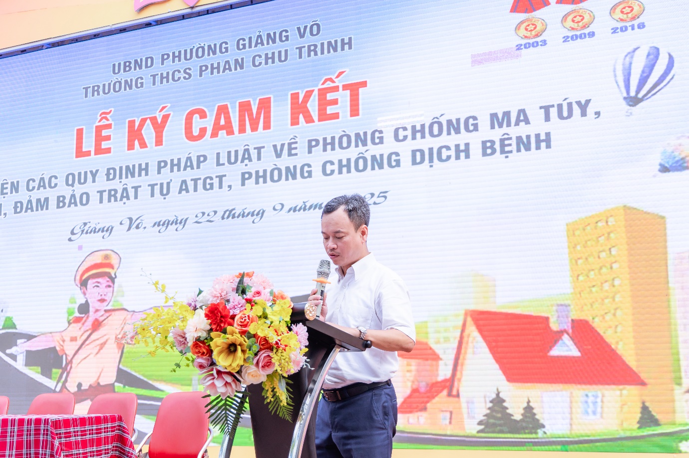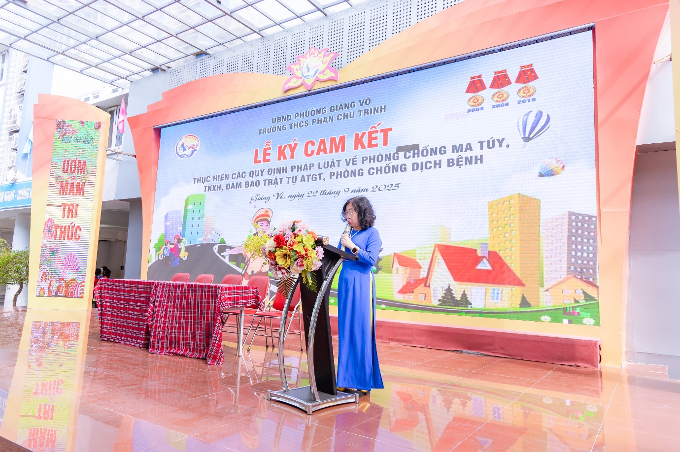 Sáng ngày 22/9/2025, trong không khí phấn khởi của những ngày đầu năm học mới 2025 – 2026, trường THCS Phan Chu Trinh đã long trọng tổ chức Lễ ký cam kết An toàn giao thông và thực hiện nghiêm các quy định pháp luật về phòng, chống tệ nạn xã hội; phòng, chống dịch bệnh trong nhà trường. Tham gia Lễ ký kết có các đồng chí là Trưởng công an phường Giảng Võ; tuyên truyền viên Phòng cảnh sát giao thông Tp.Hà Nội; đại diện Phòng VHXH phường Giảng Võ; đại diện CMHS nhà trường cùng Ban giám hiệu và toàn thể cán bộ, giáo viên, học sinh nhà trường.