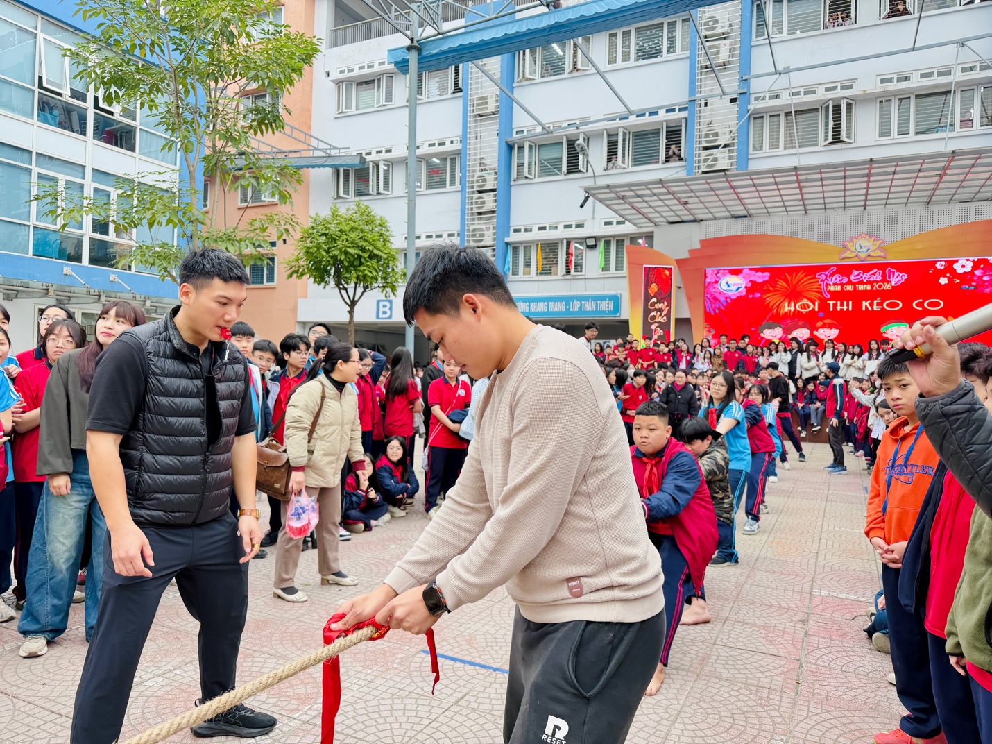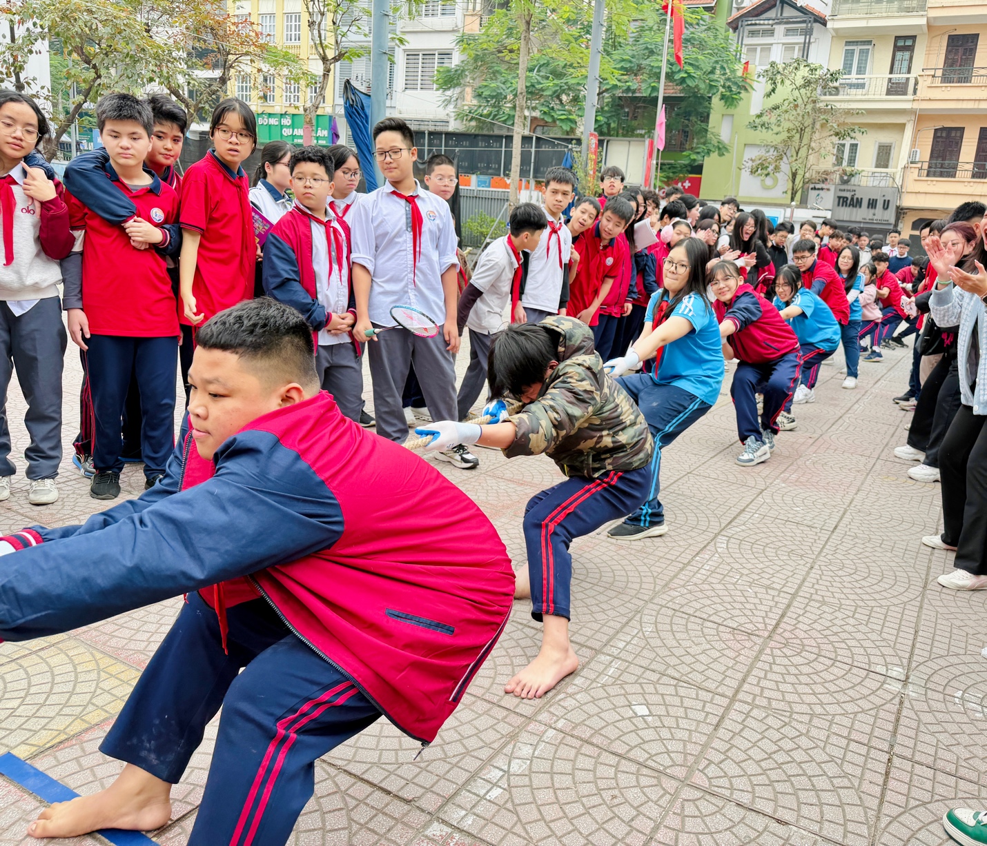 Trước giờ thi đấu, dù đến từ nhiều khối lớp khác nhau, nhưng chúng em luôn sát cánh, động viên và tin tưởng lẫn nhau. Khi tay cùng nắm chặt sợi dây thừng, mọi khoảng cách dường như không còn, thay vào đó là tinh thần đồng đội và quyết tâm chung vì màu cờ sắc áo của Cụm Lụa Vạn Phúc. Tiếng còi khai cuộc vang lên, cả đội dồn toàn bộ sức lực, chân bám chặt mặt sân, tay kéo nhịp nhàng theo tiếng hô quen thuộc. Có những lúc sợi dây nghiêng về phía đối thủ, ai nấy đều mệt mỏi, nhưng không một thành viên nào buông tay hay chùn bước.
