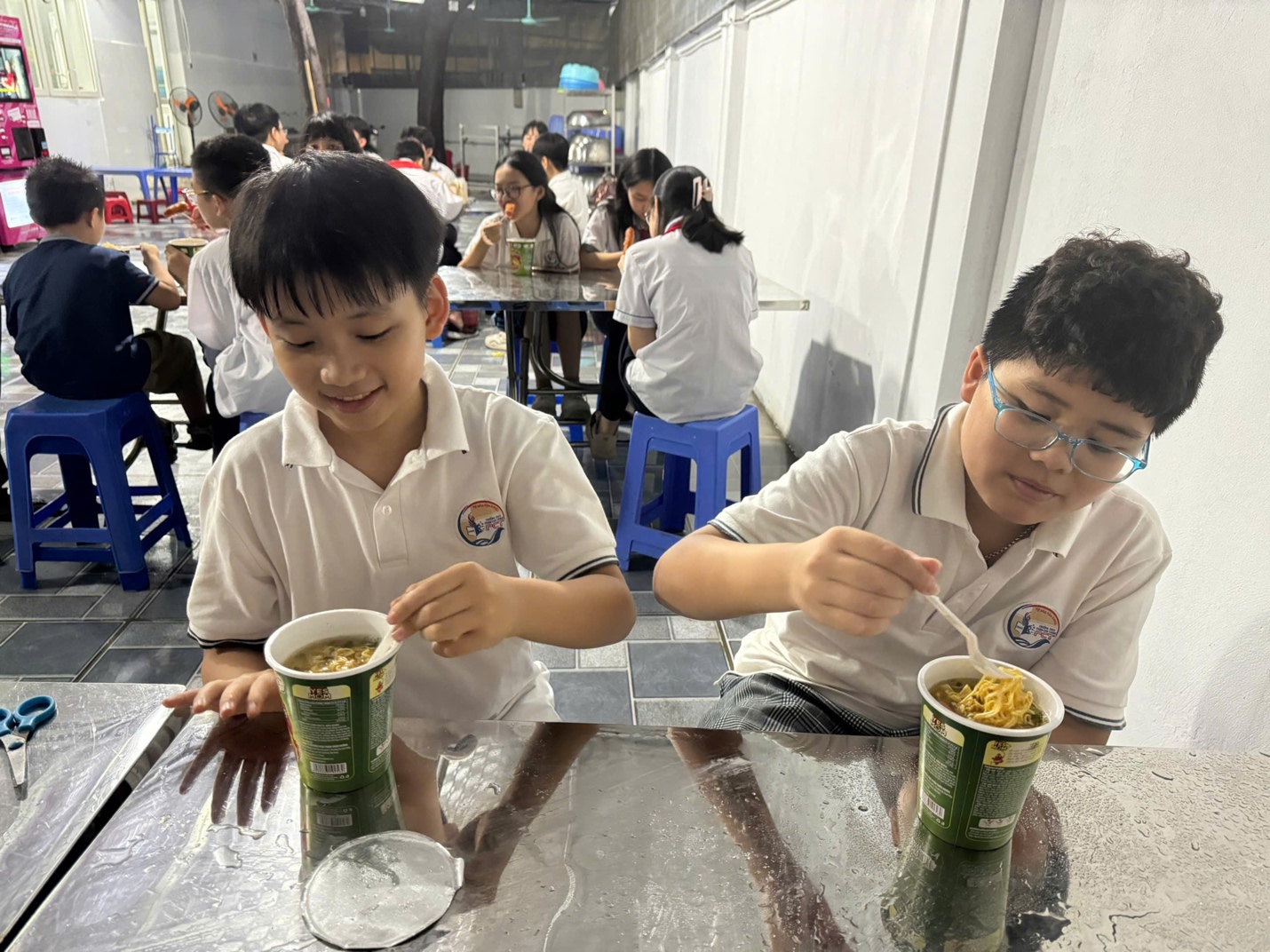 Trong suốt thời gian chờ phụ huynh, các em được bố trí chỗ nghỉ ngơi ngay tại lớp học, chuẩn bị chăn gối, đồ dùng thiết yếu, đồng thời có bữa ăn nhẹ để giữ sức khỏe. Không khí trong trường học vẫn ấm áp, an toàn, các em vừa nghỉ ngơi vừa cùng nhau sinh hoạt vui vẻ dưới sự theo dõi, động viên của thầy cô.
