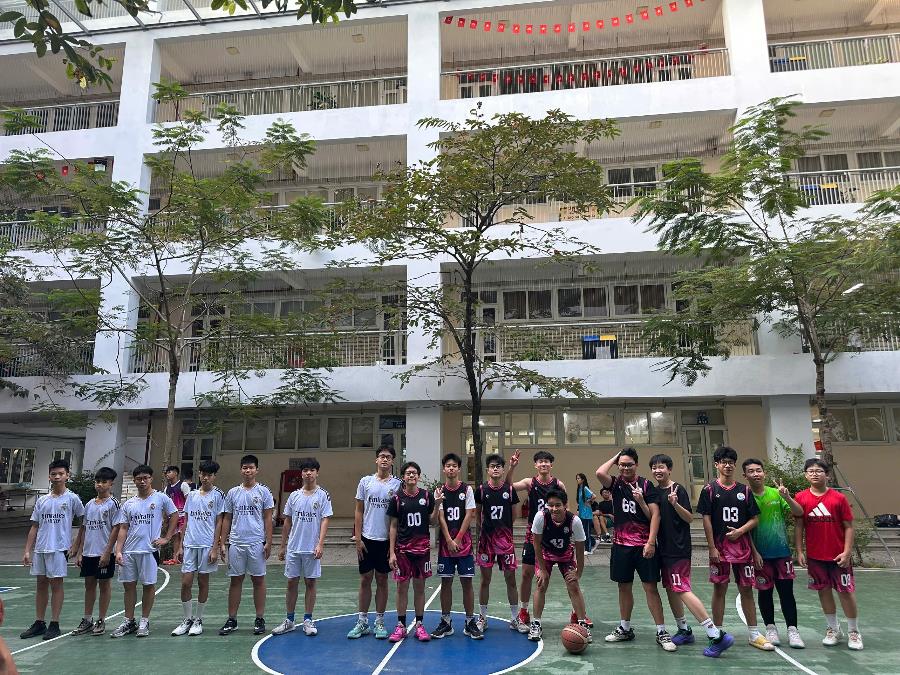 Đội bóng rổ lớp 9A8 (trái) chụp ảnh trước trận với 9A10 (phải)