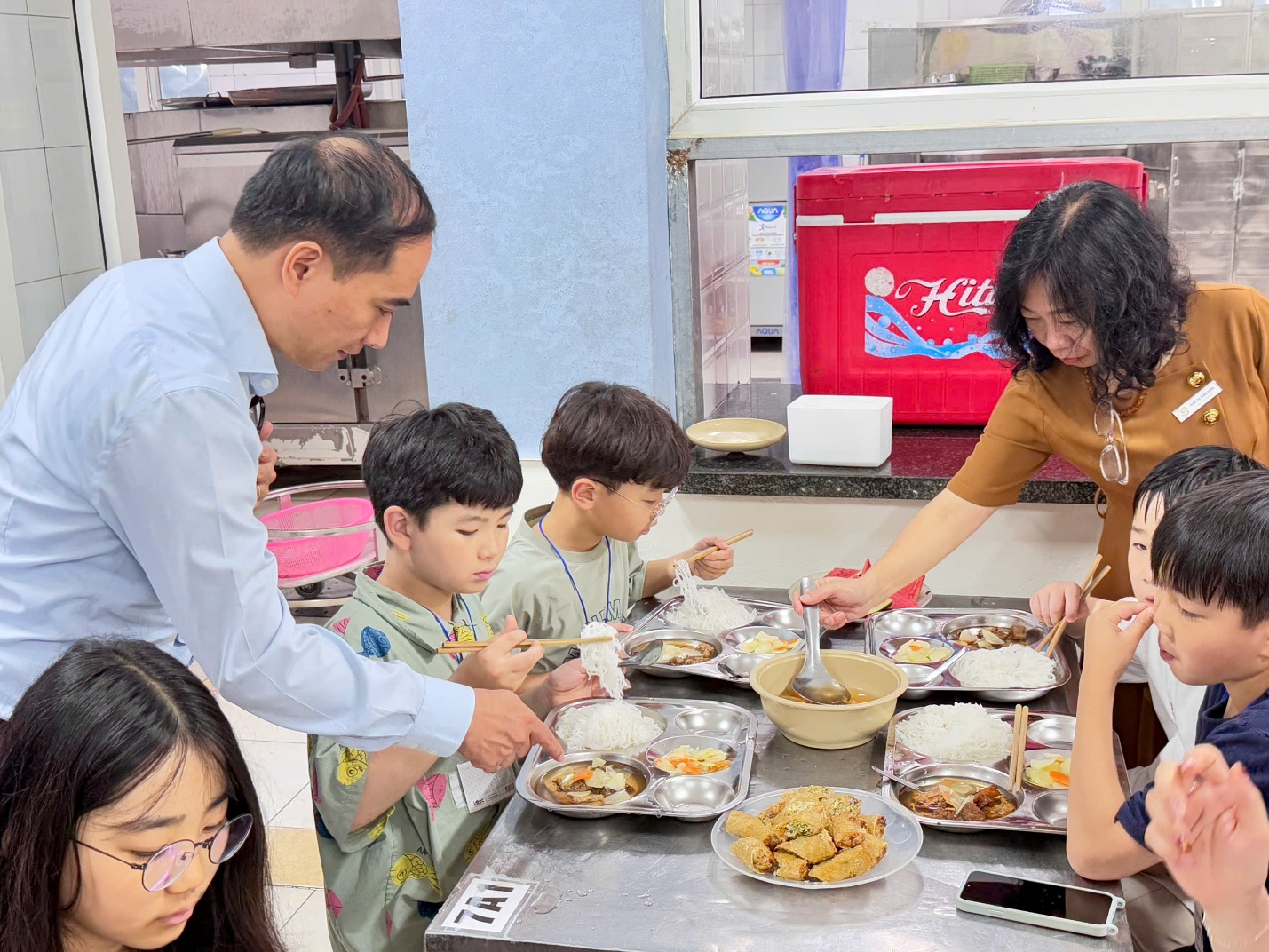 Các thầy cô trong Ban giám hiệu ân cần chăm sóc bữa ăn đặc biệt cho học sinh