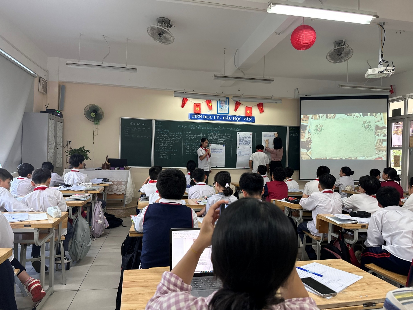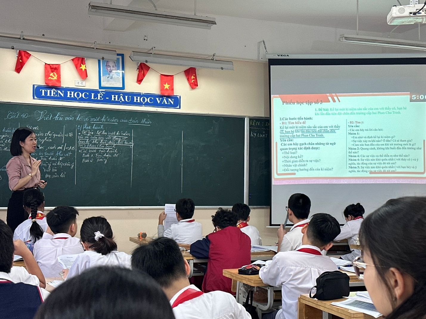 Sau đó, cô đã tỉ mỉ hướng dẫn học sinh tìm hiểu về nội dung bài học thông qua chuỗi hoạt động thảo luận nhóm và phân tích bài viết tham khảo qua các phiếu học tập, liên hệ kể về kỉ niệm dưới mái trường Phan Chu Trinh của các con. Từ đó, cô giáo giúp học sinh rút ra được kiến thức quan trọng và kĩ năng viết bài cần thiết.