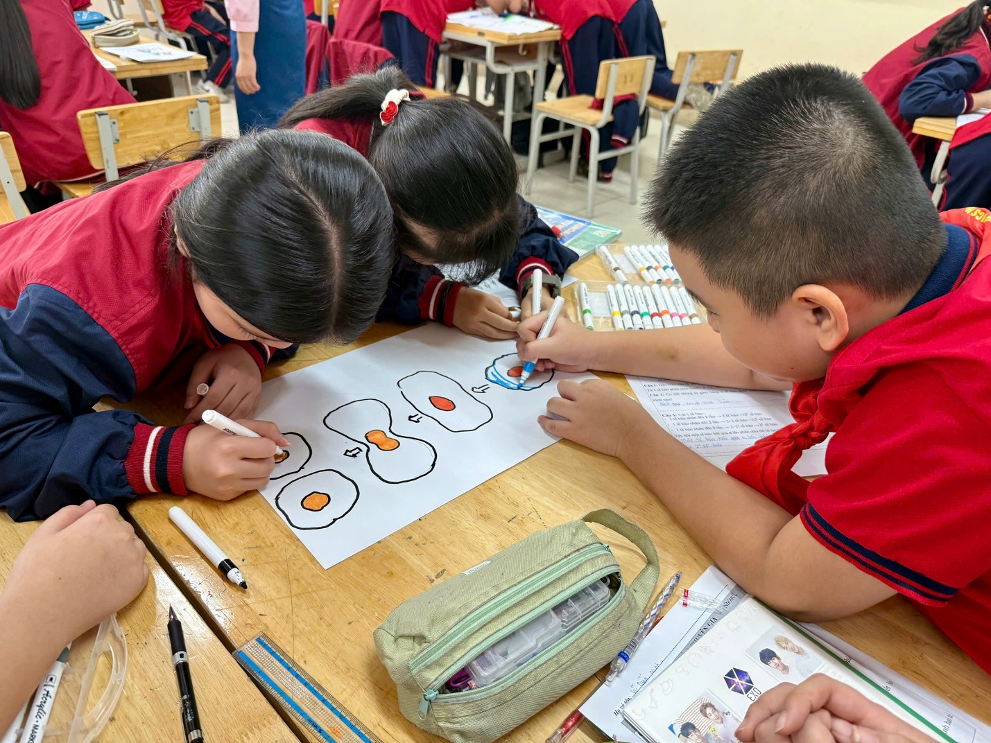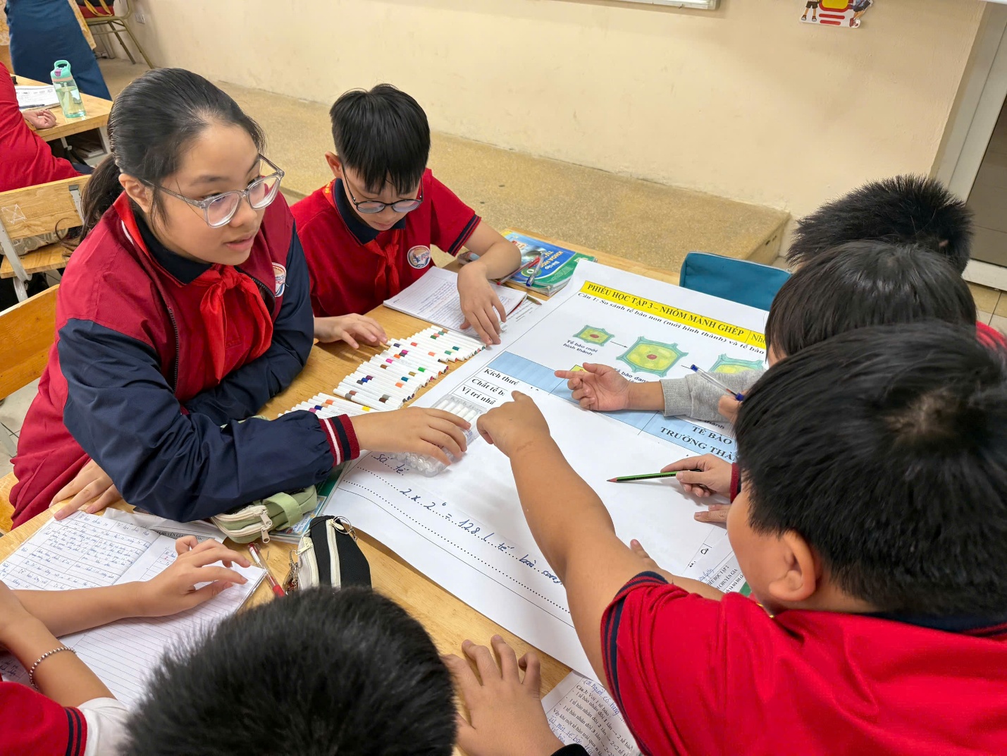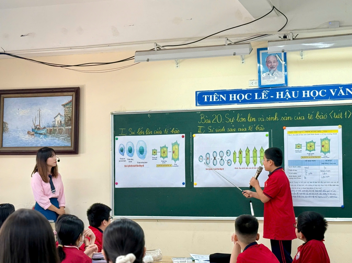 Từng phiếu học tập, từng yêu cầu thảo luận đều được sắp xếp hợp lý, giúp học sinh khám phá kiến thức mới. Cô không chỉ truyền đạt kiến thức mà còn gợi lên ở học sinh sự tò mò khoa học và khả năng tự tìm tòi. Hình ảnh những nhóm học sinh chăm chú ghi chép, trao đổi, rồi tự tin trình bày là minh chứng rõ nét cho hiệu quả của tiết dạy.