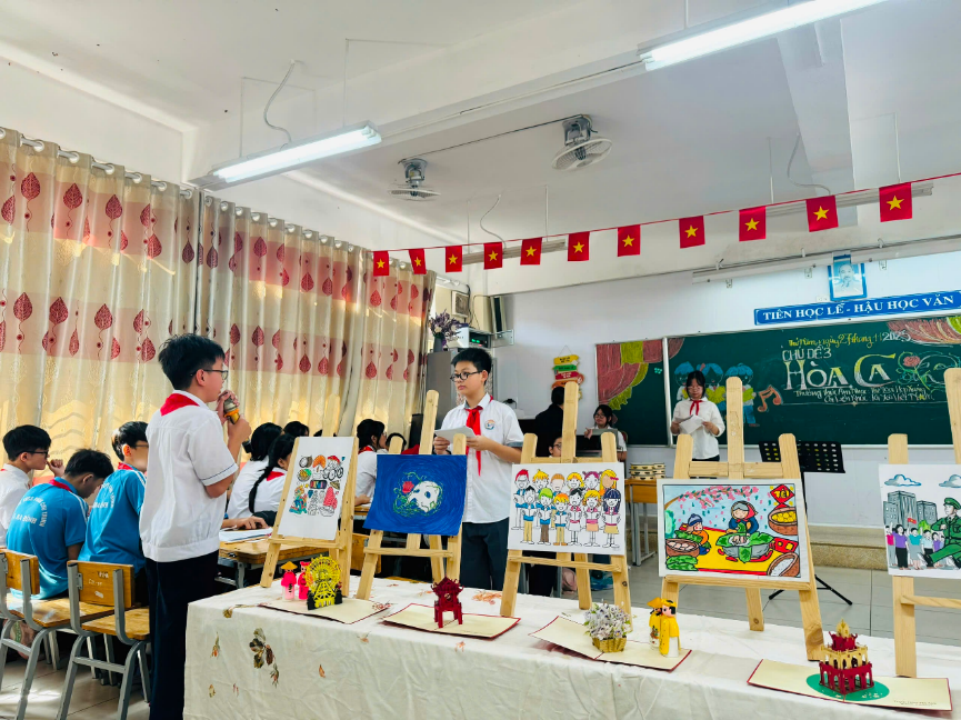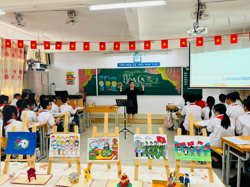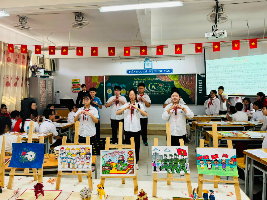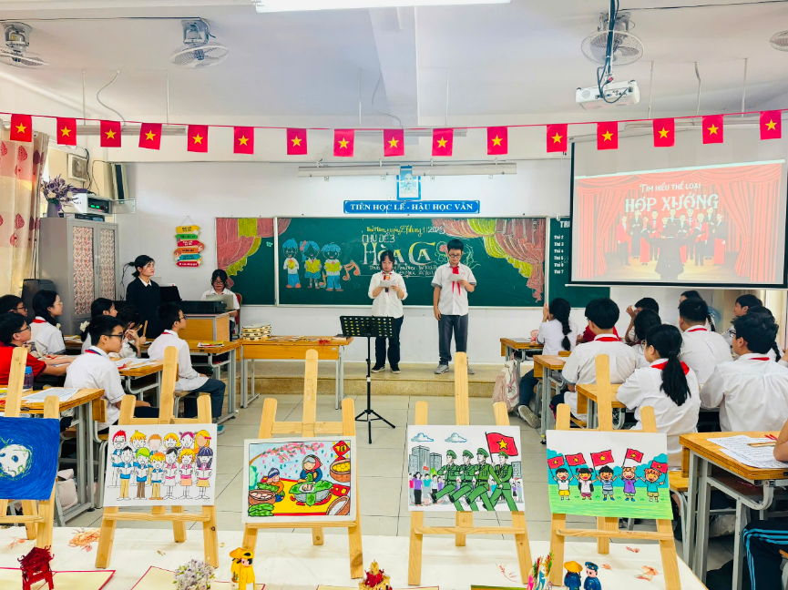 Mở đầu tiết học, học sinh được tiếp cận và tìm hiểu về hợp xướng – một hình thức biểu diễn âm nhạc giàu tính cộng hưởng và kỷ luật. Không chỉ tiếp thu kiến thức một chiều, các em còn chủ động thuyết trình, giới thiệu những video hợp xướng do chính mình sưu tầm. Khoảnh khắc cả lớp cùng lắng nghe tác phẩm “Ca ngợi Tổ quốc” đã tạo nên một không gian nghệ thuật trang nghiêm và xúc động. Những chia sẻ cảm nhận mộc mạc của học sinh đã cho thấy âm nhạc thực sự chạm đến trái tim, khơi dậy lòng yêu nước và niềm tự hào dân tộc.