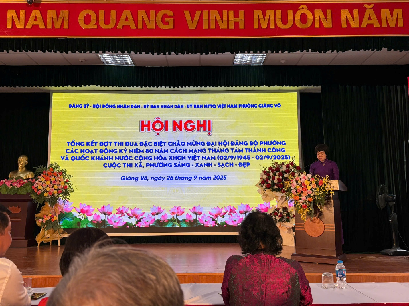 Chiều ngày 26/9/2025, tại hội trường tầng 4, trụ sở Đảng ủy – HĐND phường Giảng Võ (số 9 Thành Công, phường Giảng Võ, thành phố Hà Nội), Ủy ban nhân dân phường Giảng Võ đã long trọng tổ chức Hội nghị tổng kết công tác tổ chức các hoạt động kỷ niệm 80 năm Cách mạng Tháng Tám thành công và Quốc khánh 2/9.