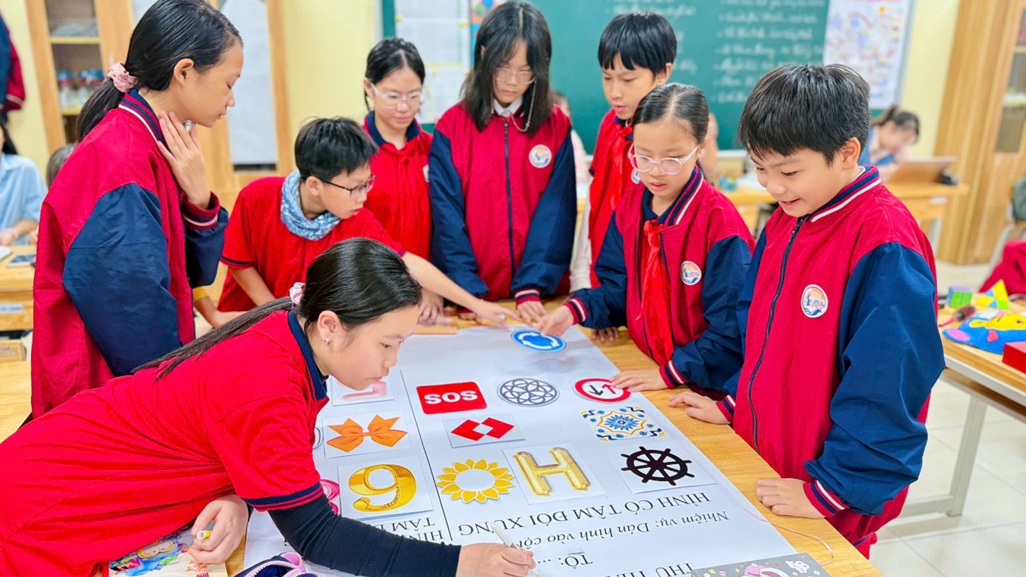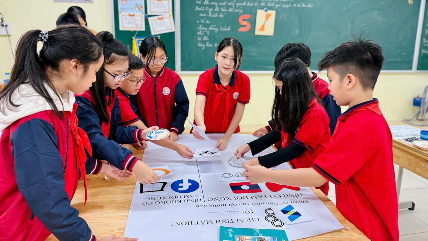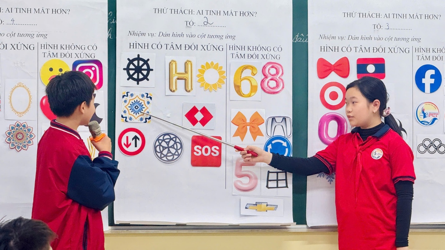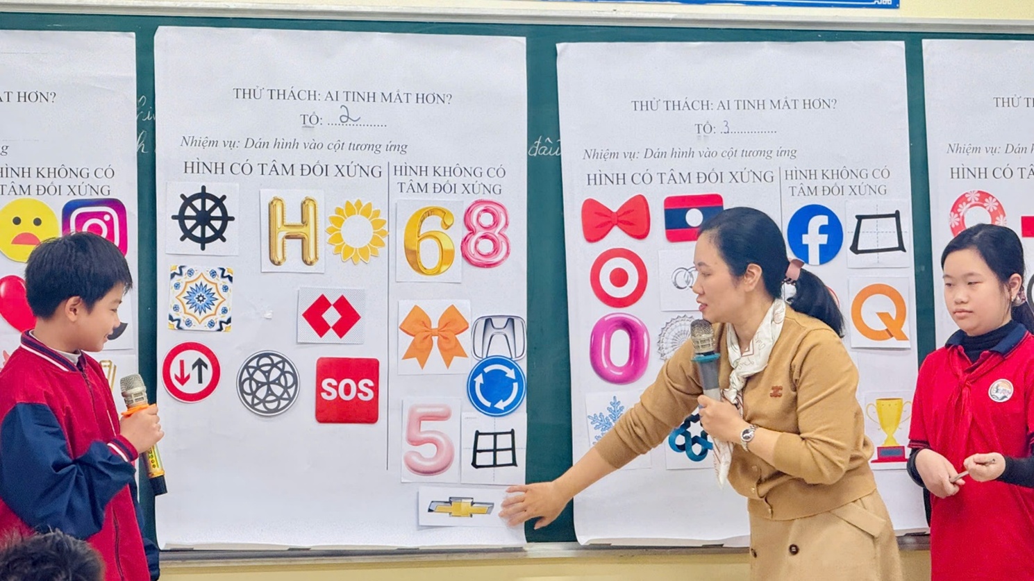 Trong suốt tiết học, cô Dung đã lồng ghép nhiều thử thách thú vị để học sinh tham gia: từ nhận biết hình có tâm đối xứng, thảo luận nhóm đến giải quyết những tình huống gắn với đời sống. Các hoạt động được tổ chức tự nhiên, linh hoạt, khuyến khích học sinh suy nghĩ, trình bày ý kiến và hợp tác với nhau.