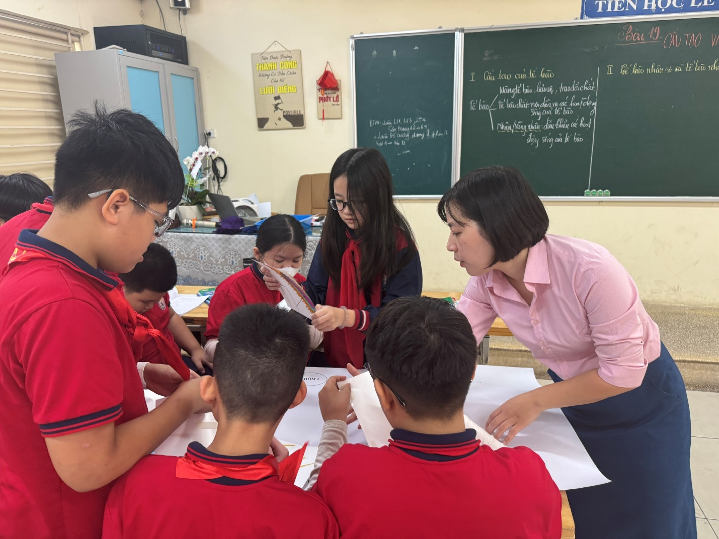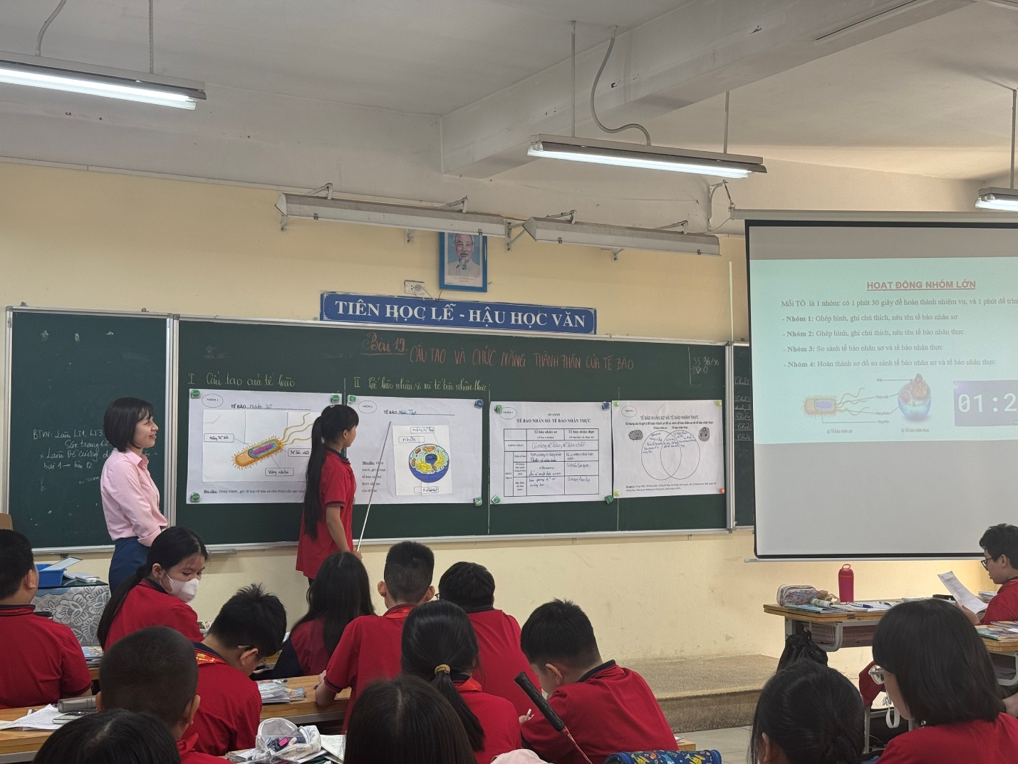 Những phiếu học tập, hoạt động nhóm, thảo luận đôi… đều được cô triển khai nhịp nhàng, cho thấy sự sáng tạo và linh hoạt trong phương pháp sư phạm của cô. Học sinh được tự mình khám phá kiến thức mới: vẽ hình tế bào, giải thích chức năng từng thành phần – từ màng tế bào, tế bào chất đến nhân.