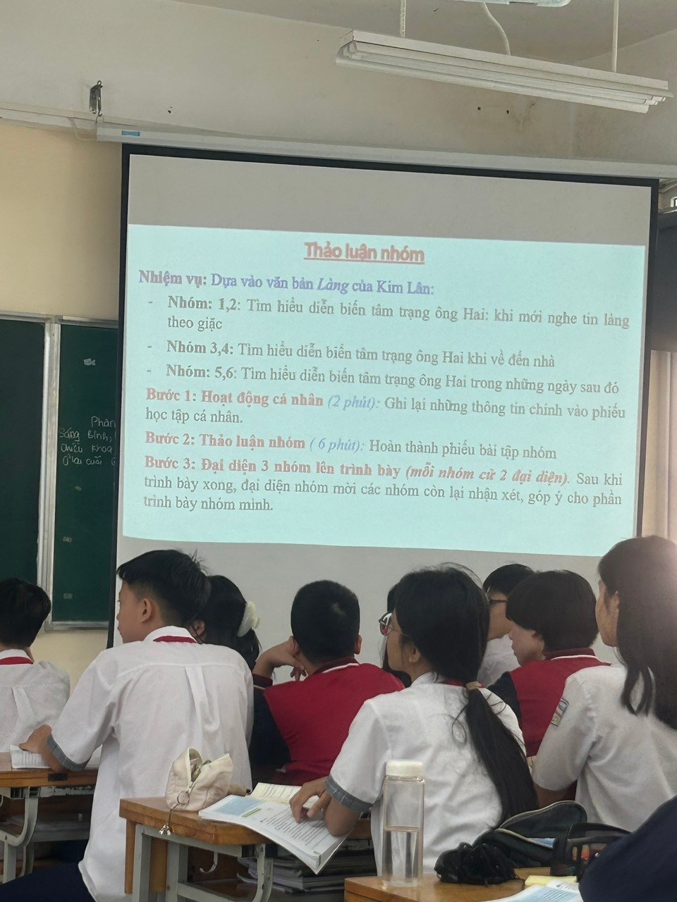Tiết Ngữ văn của cô Nguyễn Thị Thư gây ấn tượng bởi sự chuẩn bị công phu và cách dẫn dắt tự nhiên. Khi tìm hiểu tác phẩm Làng, học sinh được thảo luận nhóm, phân tích chi tiết và chia sẻ cảm nhận. Việc ghi nhận – phản hồi kịp thời giúp các em mạnh dạn hơn trong diễn đạt ý kiến, từ đó tiếp cận văn bản một cách sâu sắc.