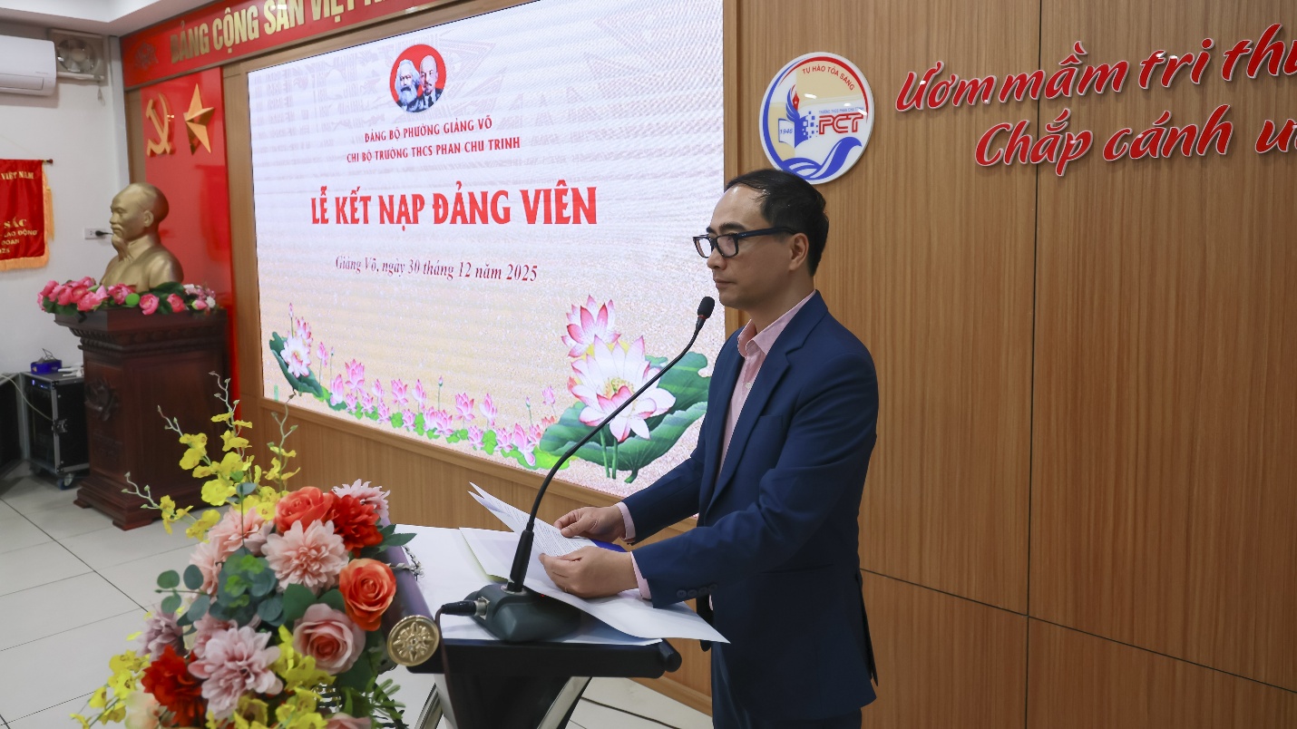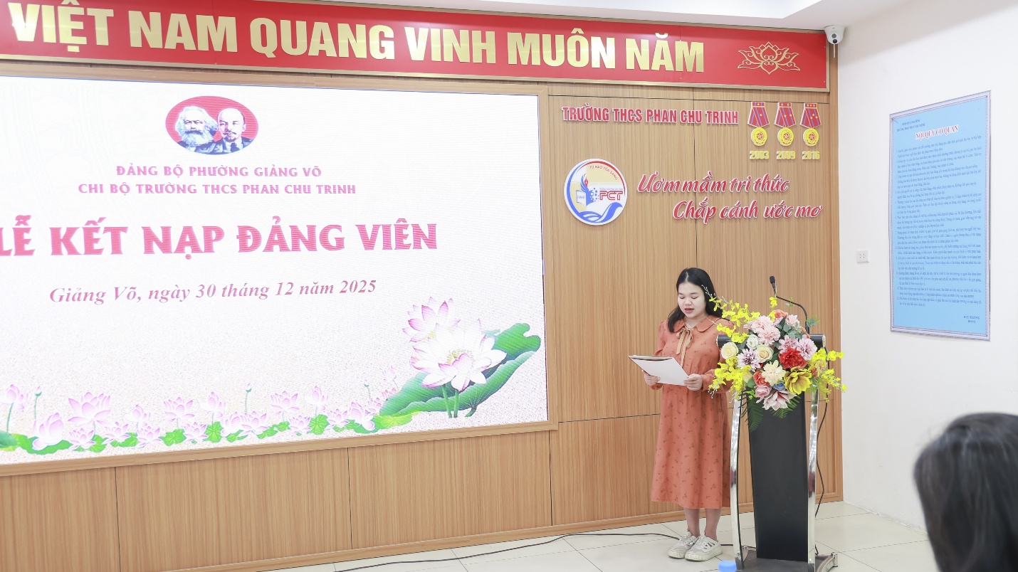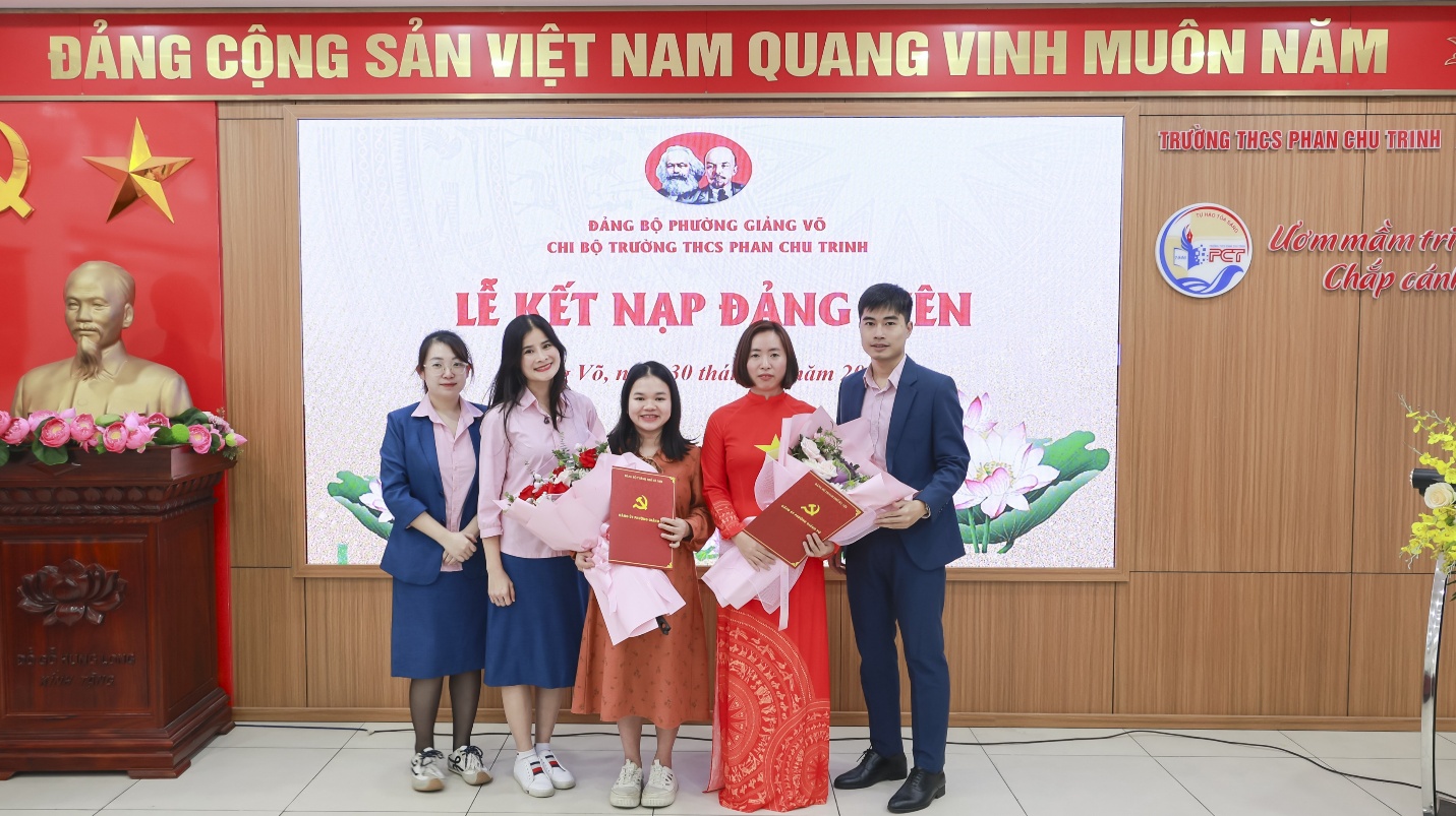 Thực hiện Điều lệ Đảng Cộng sản Việt Nam và kế hoạch công tác xây dựng Đảng năm 2025, chiều ngày 30/12/2025, Chi bộ Trường THCS Phan Chu Trinh đã long trọng tổ chức Lễ kết nạp đảng viên mới cho hai quần chúng ưu tú Cấn Thị Duyên và Nguyễn Quỳnh Chi sau quá trình rèn luyện, phấn đấu và được tổ chức Đảng xem xét, bồi dưỡng.
