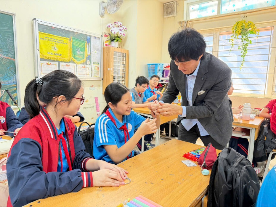 Học sinh Dương Thanh Tâm lớp 8A11 thích thú làm đồ chơi với sự hướng dẫn của thầy giáo người Hàn Quốc