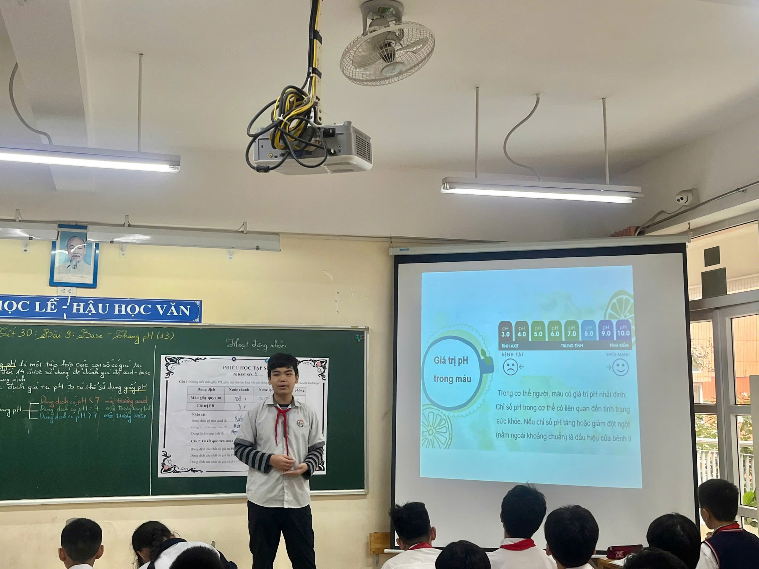 Không chỉ vậy, tiết học còn giúp học sinh nâng cao năng lực giao tiếp và hợp tác. Trong giờ học, học sinh tự tin trình bày kết quả tìm hiểu liên hệ được pH trong dạ dày, trong máu, trong nước mưa, đất.