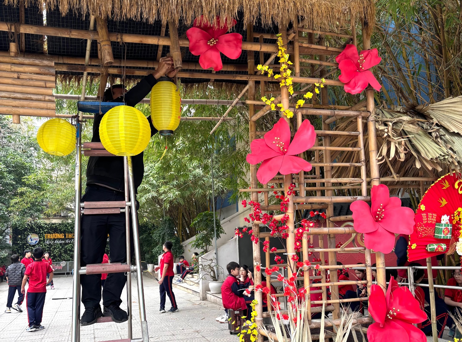 Các lối đi trong sân trường được trang hoàng bằng đèn lồng, cờ dây, mang đến không gian rực rỡ, sinh động, thu hút ánh nhìn của học sinh ngay từ khi bước qua cổng trường.