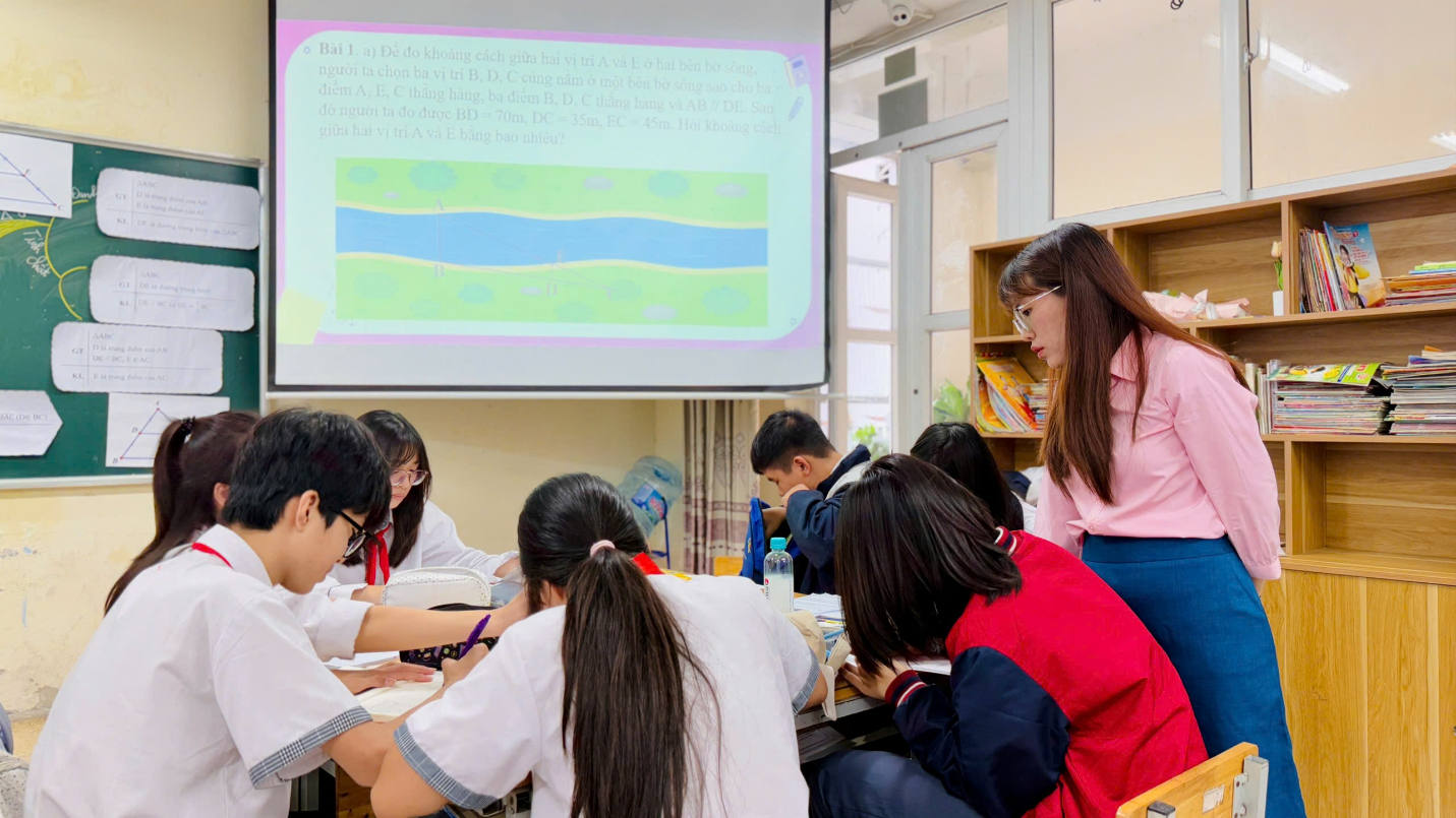 Giáo viên giữ vai trò người dẫn dắt, theo sát tiến trình làm việc của từng nhóm. Cô Thủy kịp thời phát hiện những sai sót thường gặp, hướng dẫn các em cách đọc hình, cách suy luận từ giả thiết đến kết luận, đồng thời gợi mở nhiều câu hỏi để học sinh tự tìm ra hướng giải quyết. Nhờ sự đồng hành tận tâm của giáo viên, các em dần củng cố được tư duy hình học, biết cách trình bày lời giải mạch lạc hơn và hiểu sâu sắc giá trị của định lý Thales trong việc giải quyết các bài toán về tỉ số đoạn thẳng.