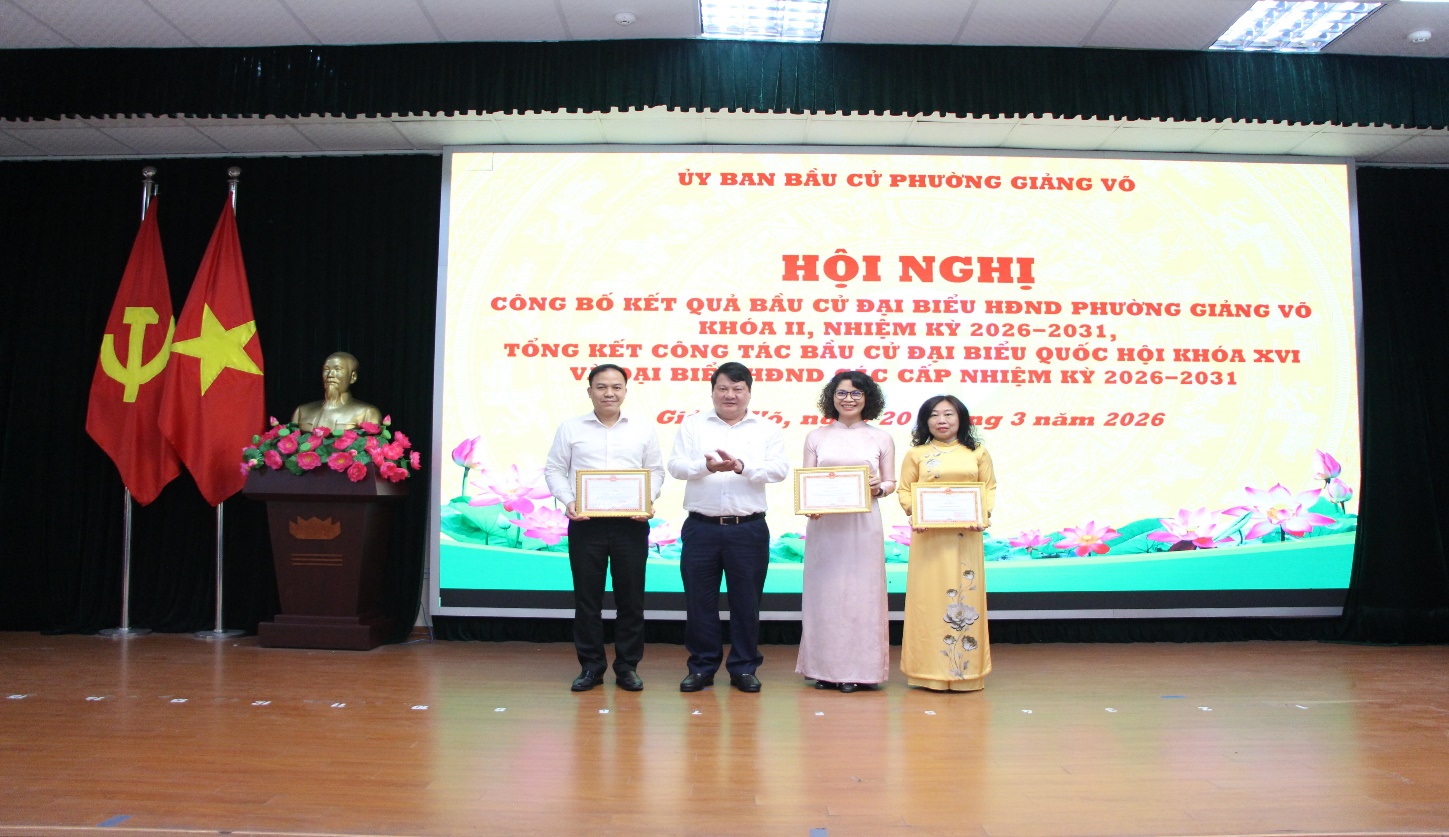 Chiều 20/3/2026, Ủy ban Bầu cử phường Giảng Võ tổ chức tổng kết công tác bầu cử đại biểu Quốc hội khóa XVI và đại biểu HĐND các cấp nhiệm kỳ 2026-2031; công bố kết quả bầu cử đại biểu HĐND phường khóa II, nhiệm kỳ 2026-2031 và khen thưởng các tập thể và cá nhân có thành tích xuất sắc trong công tác bầu cử trong đó có trường THCS Phan Chu Trinh.