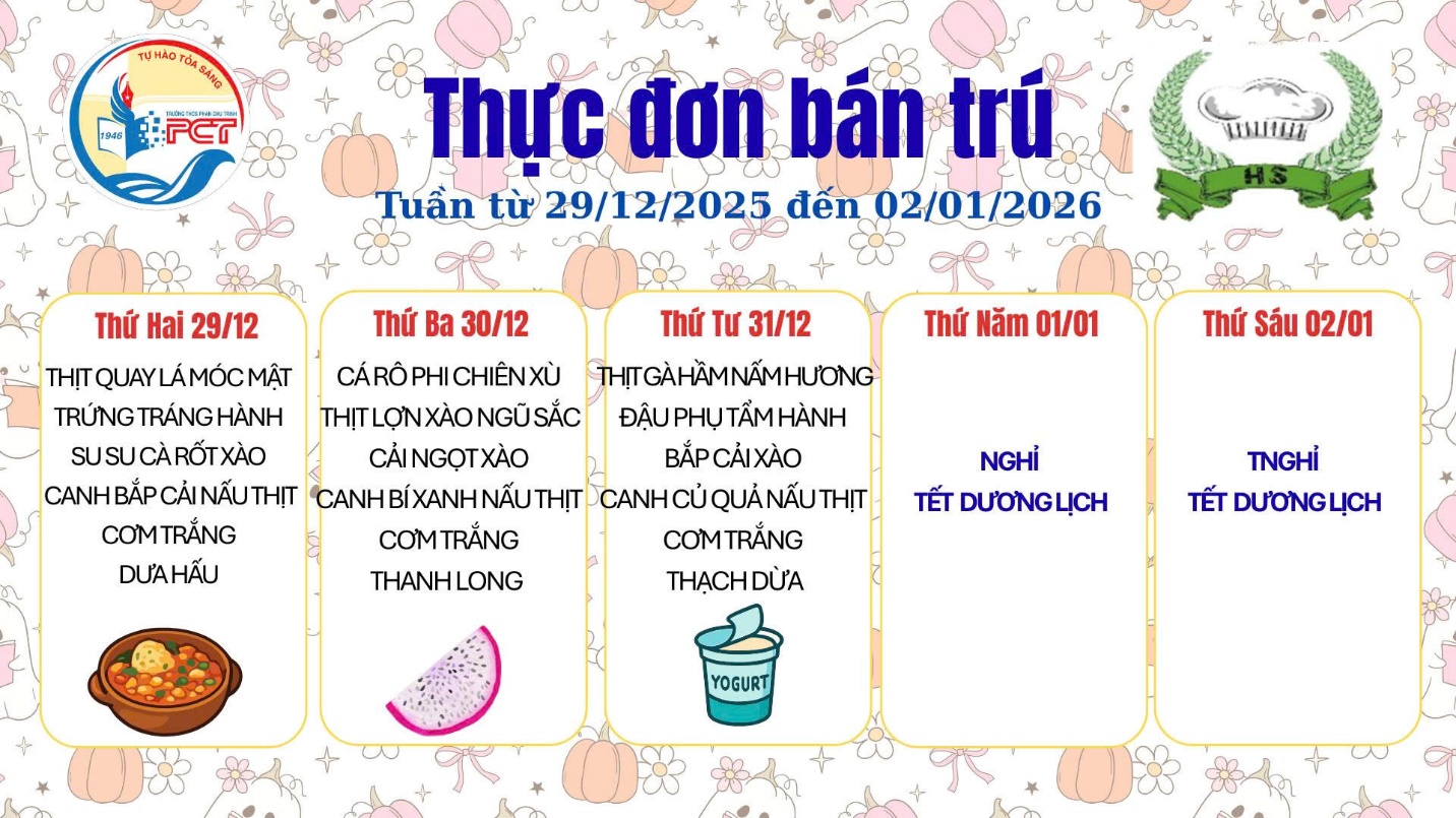 Thực đơn bán trú từ ngày 29/12/2025 đến ngày 2/1/2026