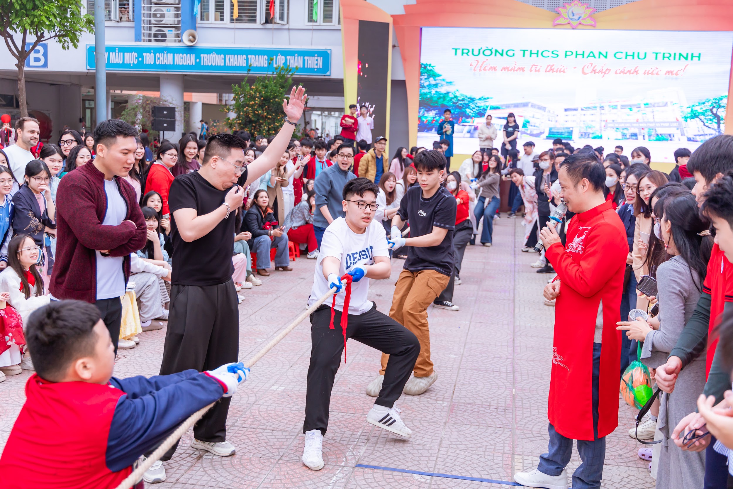 Trong không khí sôi nổi của các hoạt động thi đua chào mừng phong trào thể dục thể thao của nhà trường, vòng bán kết Hội thi kéo co Trường THCS Phan Chu Trinh đã diễn ra đầy kịch tính và hào hứng, thu hút sự quan tâm, cổ vũ nhiệt tình của đông đảo thầy cô và học sinh toàn trường giữa các đội Lụa Vạn Phúc, Hàn Quốc, Quạt Chàng Sơn, Làng hoa.