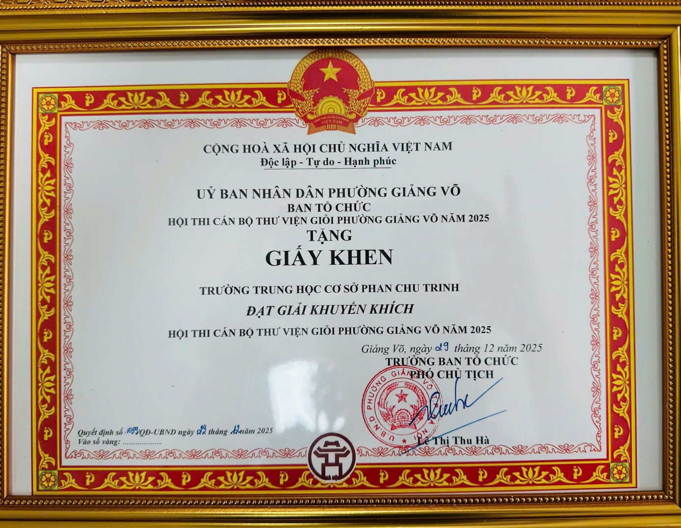 Tại Hội thi Cán bộ Thư viện giỏi phường Giảng Võ năm 2025, Trường THCS Phan Chu Trinh vinh dự được trao Giấy khen đạt giải Khuyến khích, ghi nhận những nỗ lực, sáng tạo và tinh thần trách nhiệm của cán bộ thư viện nhà trường trong công tác xây dựng và phát triển văn hóa đọc.
