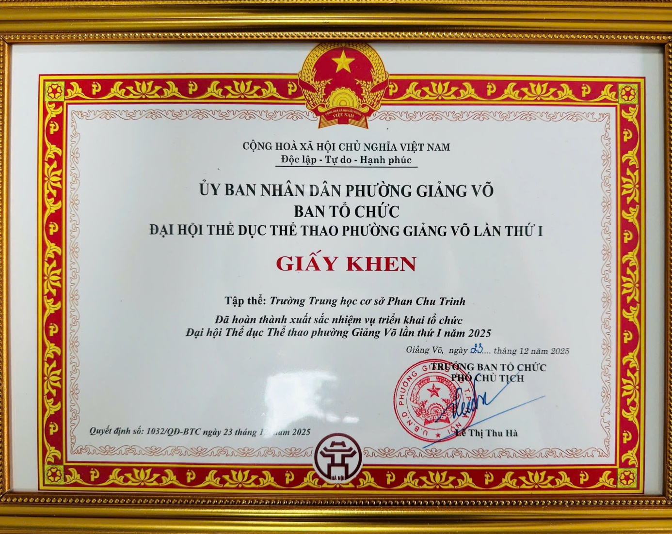 Trong khuôn khổ Hội nghị tổng kết phong trào thể dục thể thao năm 2025, Trường THCS Phan Chu Trinh đã vinh dự được trao Giấy khen “Hoàn thành xuất sắc nhiệm vụ triển khai, tổ chức Đại hội Thể dục Thể thao phường Giảng Võ lần thứ I năm 2025”.