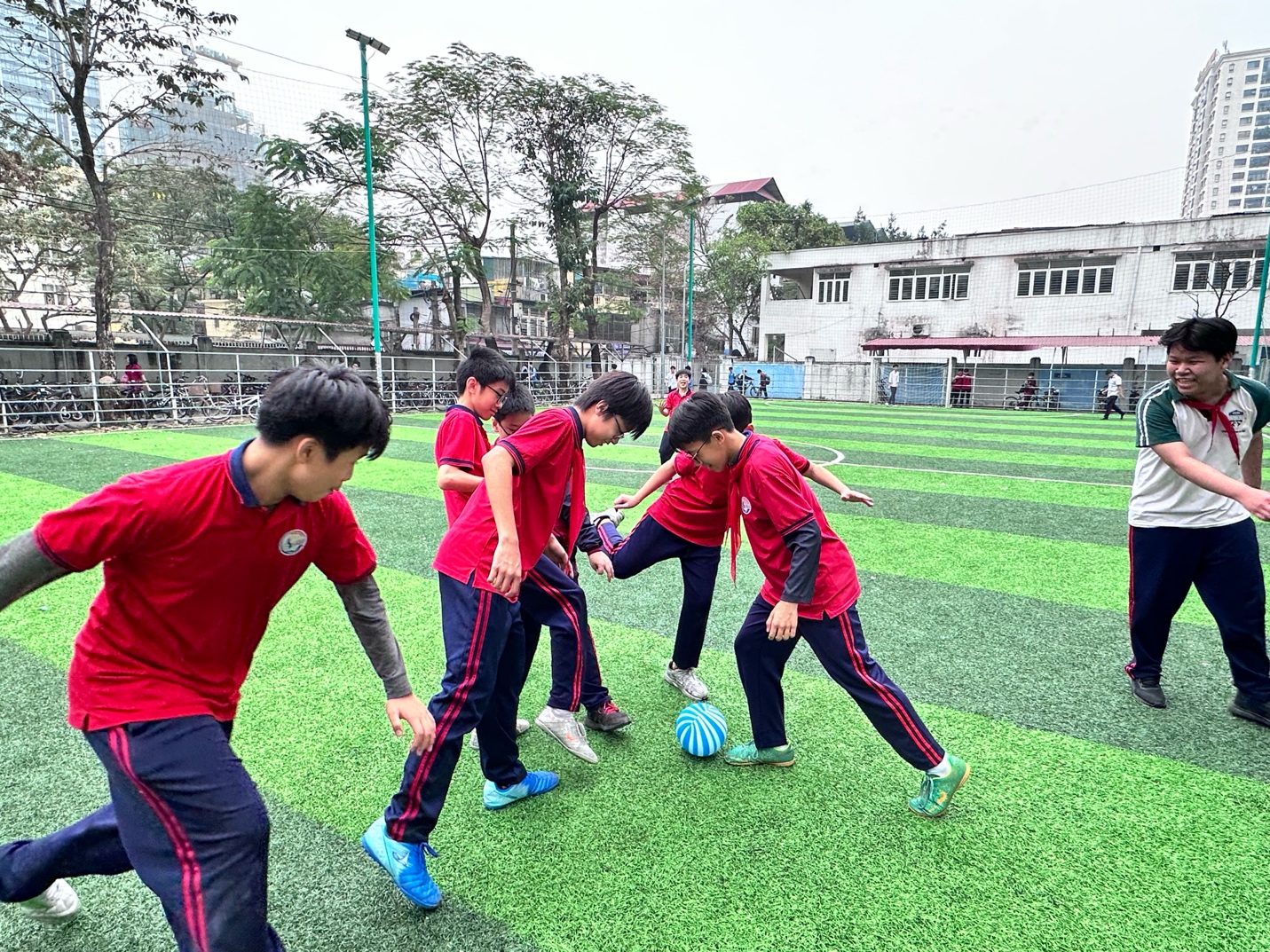 Trong không gian sân trường rộng rãi, thoáng mát, các em học sinh hào hứng tham gia nhiều hoạt động thể thao sôi nổi như đá bóng, bóng rổ. Những bước chạy nhanh nhẹn, những tiếng cười rộn ràng không chỉ giúp các em rèn luyện sức khỏe mà còn tăng cường tinh thần đoàn kết, sự tự tin và kỹ năng làm việc nhóm.