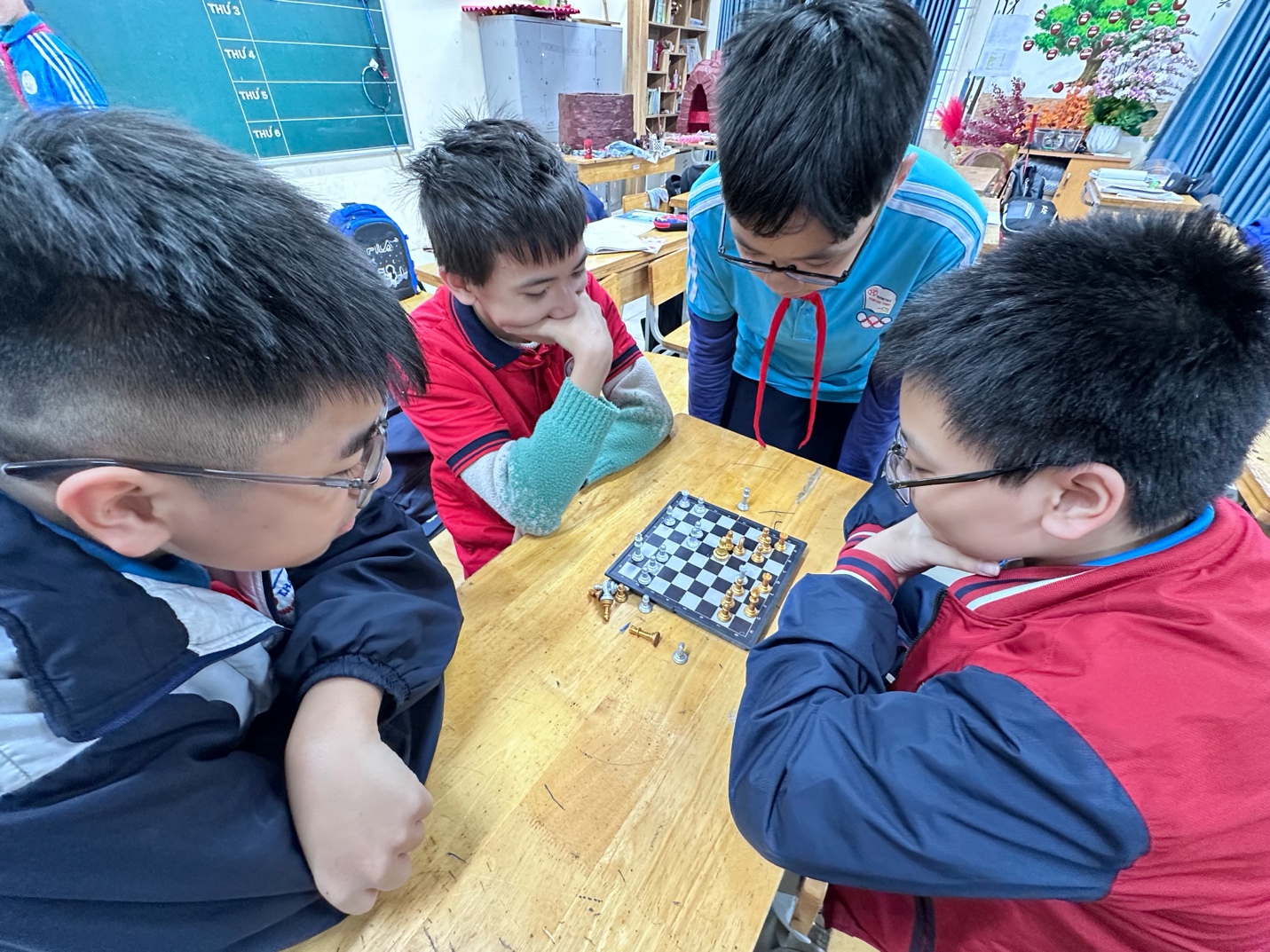 Bên cạnh các hoạt động vận động, nhiều học sinh lại lựa chọn những trò chơi mang tính trí tuệ như cờ vua, cờ tướng. Những ván cờ diễn ra trong không khí tập trung nhưng không kém phần hào hứng, giúp các em rèn luyện tư duy logic, khả năng quan sát và tính kiên nhẫn.
