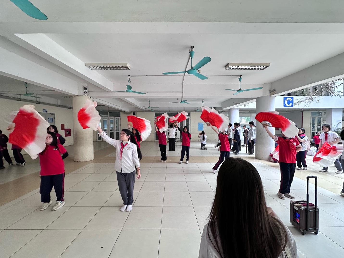 Đặc biệt, giờ ra chơi còn là lúc các em học sinh thể hiện năng khiếu nghệ thuật thông qua những hoạt động tập luyện múa, biểu diễn cho các chương trình của nhà trường. Những động tác uyển chuyển, đều đặn, những chiếc quạt đỏ trắng nổi bật đã góp phần tạo nên một khung cảnh sinh động, tươi vui và đầy sức trẻ trong khuôn viên trường.