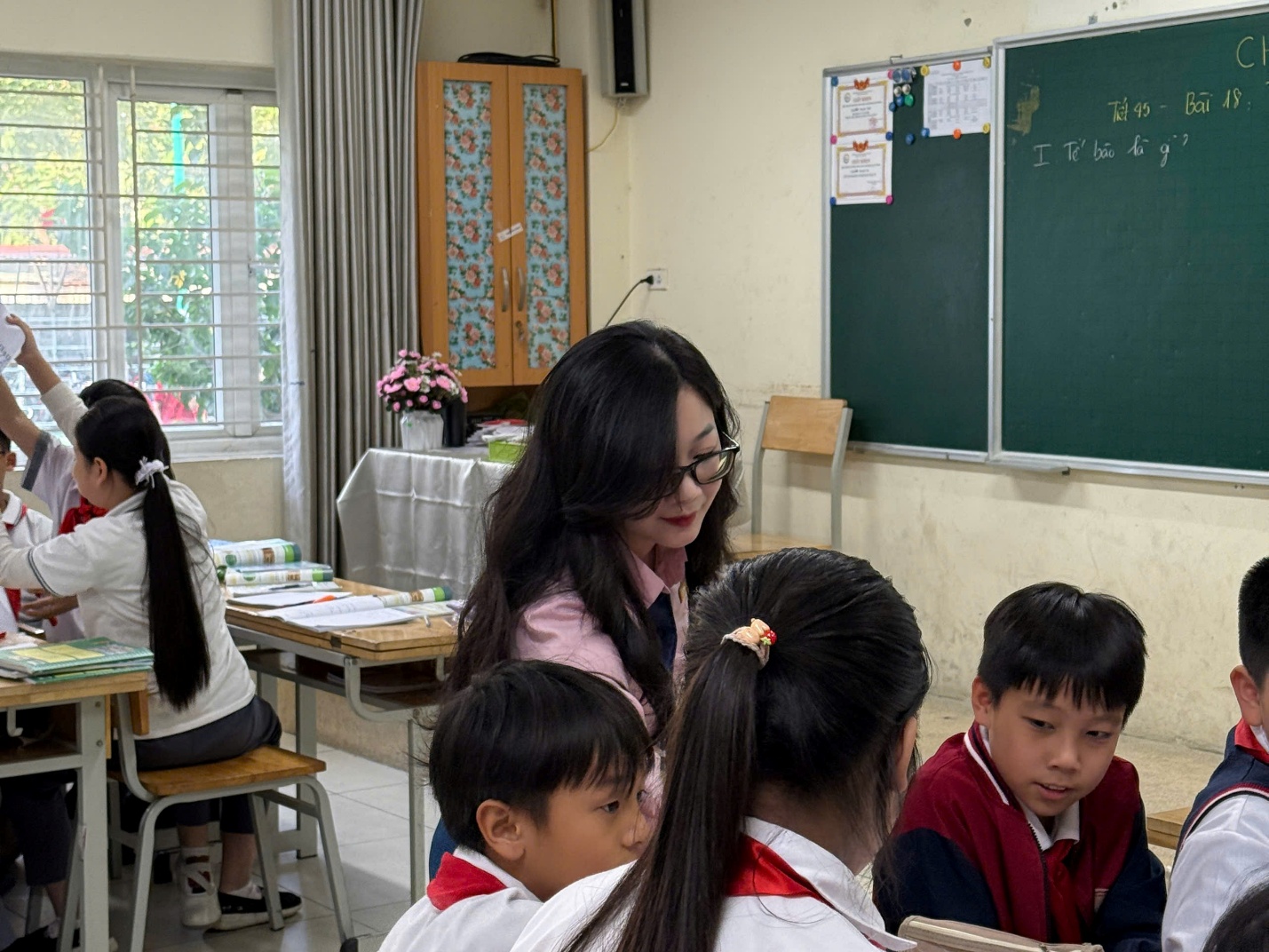 Cô Thúy Vân đang hướng dẫn học sinh trong hoạt động nhóm