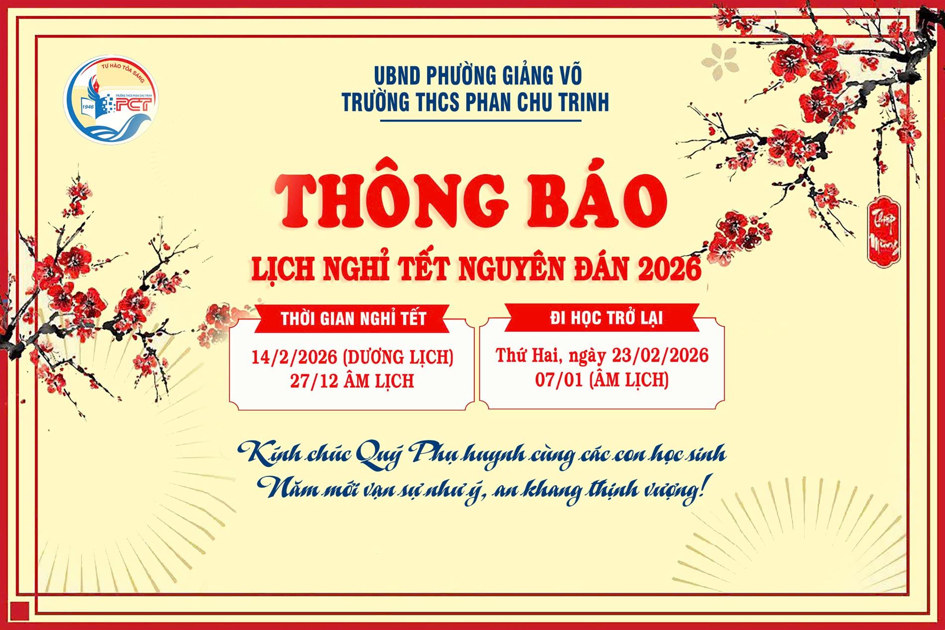 Trường THCS Phan Chu Trinh thông báo Lịch nghỉ Tết Dương lịch