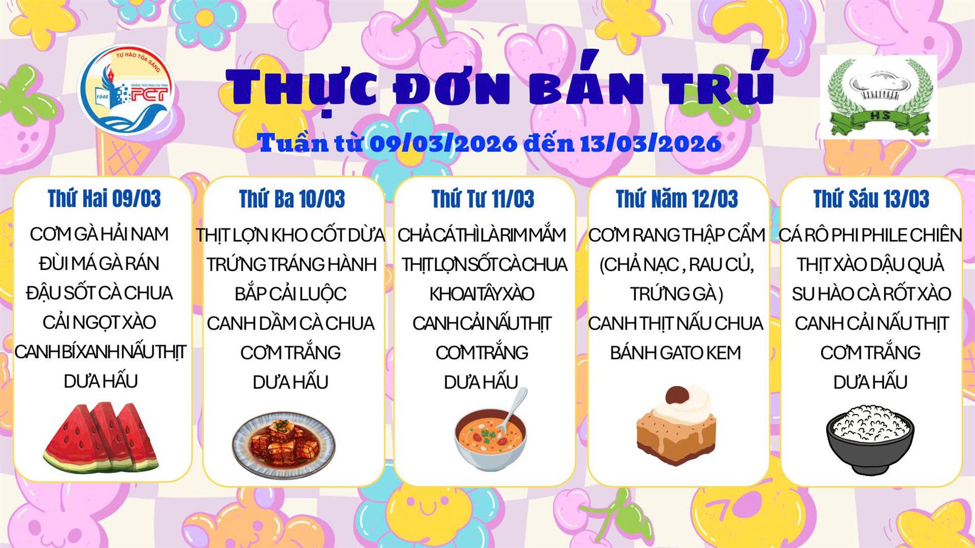 Thực đơn bán trú của trường THCS Phan Chu Trinh từ ngày 9/3 đến ngày 13/3/2026