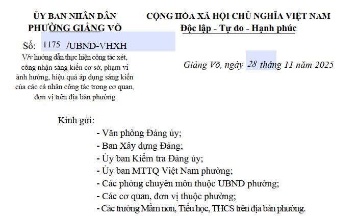 Công văn số 1175/UBND-VHXH của UBND Phường Giảng Võ hướng dẫn thực hiện công tác xét, công nhận sáng kiến cơ sở