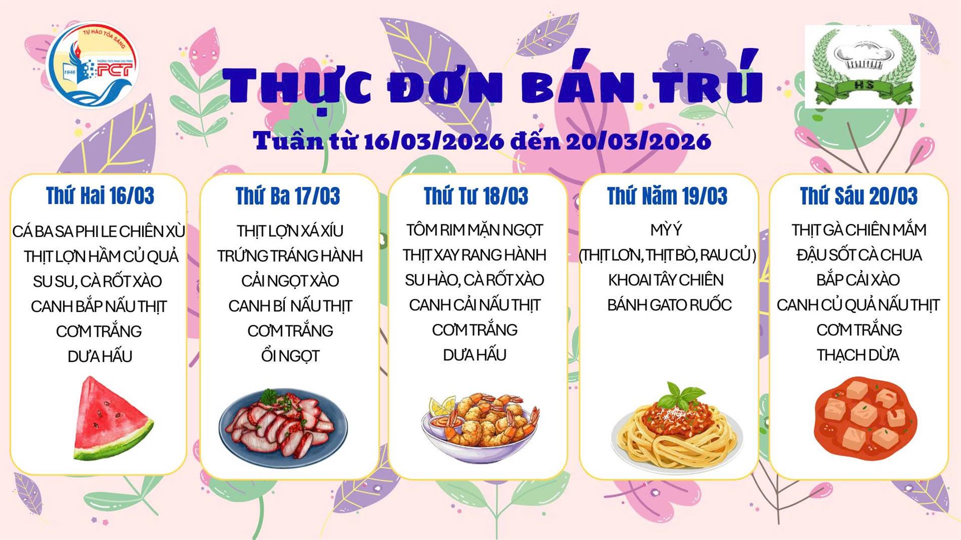 Thực đơn bán trú từ 16/03 đến 20/03/2026