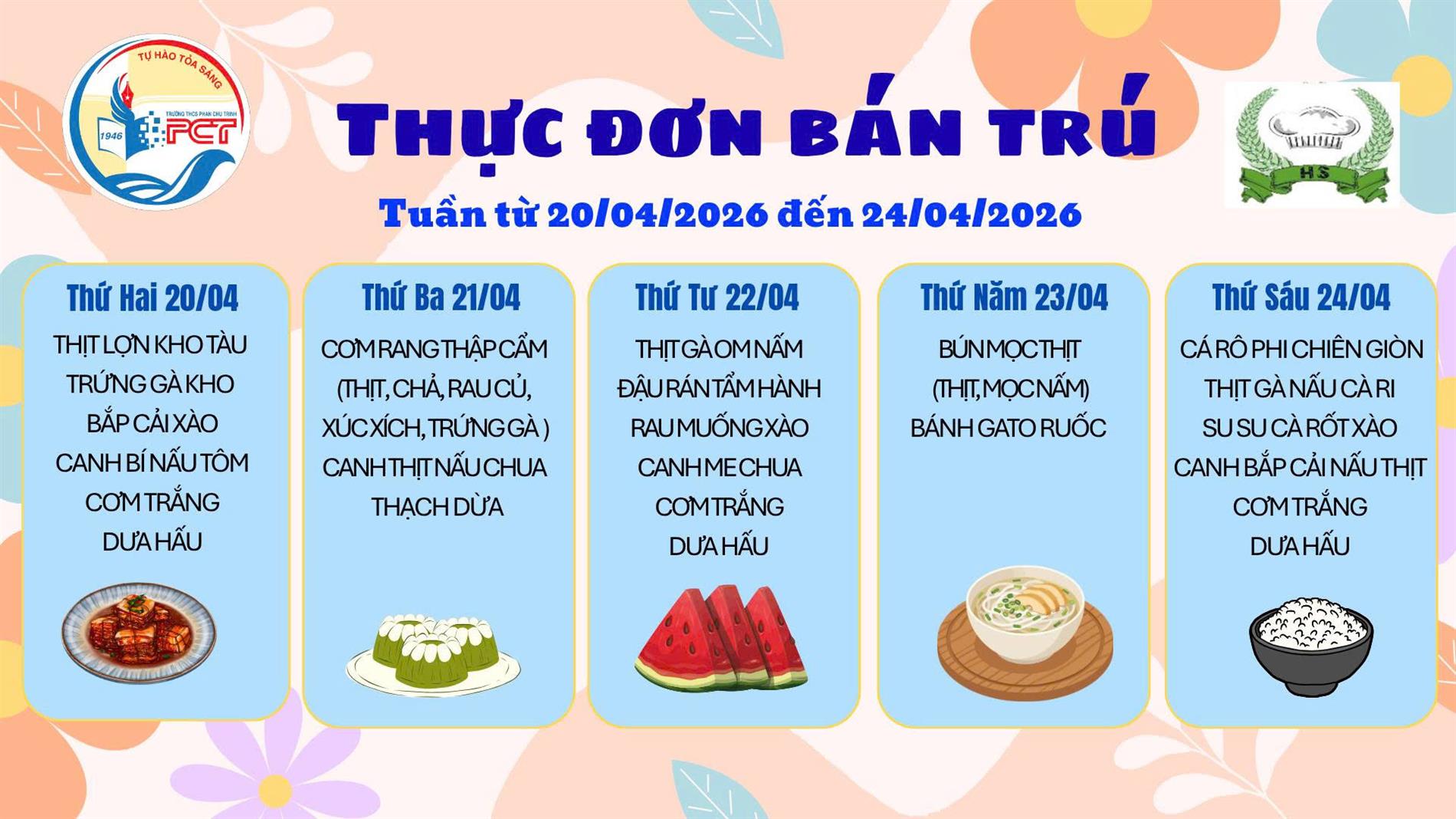 Thực đơn bán trú từ ngày 20/4 đến 24/4/2026 của Trường THCS Phan Chu Trinh