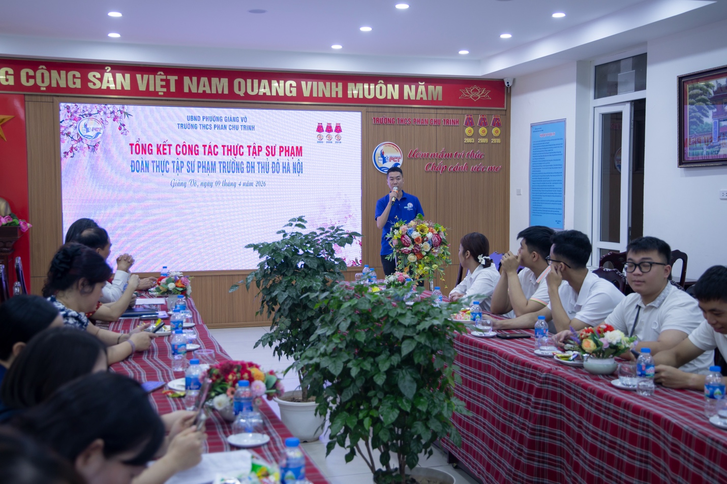 Mở đầu chương trình là phần tuyên bố lý do, giới thiệu đại biểu. Đại diện Ban Giám hiệu, thầy Trần Thanh Việt đã phát biểu, ghi nhận tinh thần nghiêm túc, trách nhiệm và sự tiến bộ rõ rệt của các sinh viên trong quá trình thực tập tại trường. Những chia sẻ chân thành của thầy đã tiếp thêm động lực cho các sinh viên trên hành trình theo đuổi nghề giáo.