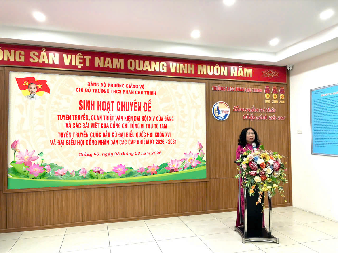 Bên cạnh đó, Chi bộ Trường THCS Phan Chu Trinh đã triển khai nội dung tuyên truyền về ý nghĩa, tầm quan trọng của cuộc bầu cử đại biểu Quốc hội khóa XV và đại biểu Hội đồng nhân dân các cấp nhiệm kỳ 2026 – 2031, khẳng định đây là sự kiện chính trị quan trọng của đất nước, thể hiện quyền làm chủ của Nhân dân trong việc xây dựng Nhà nước pháp quyền xã hội chủ nghĩa Việt Nam.