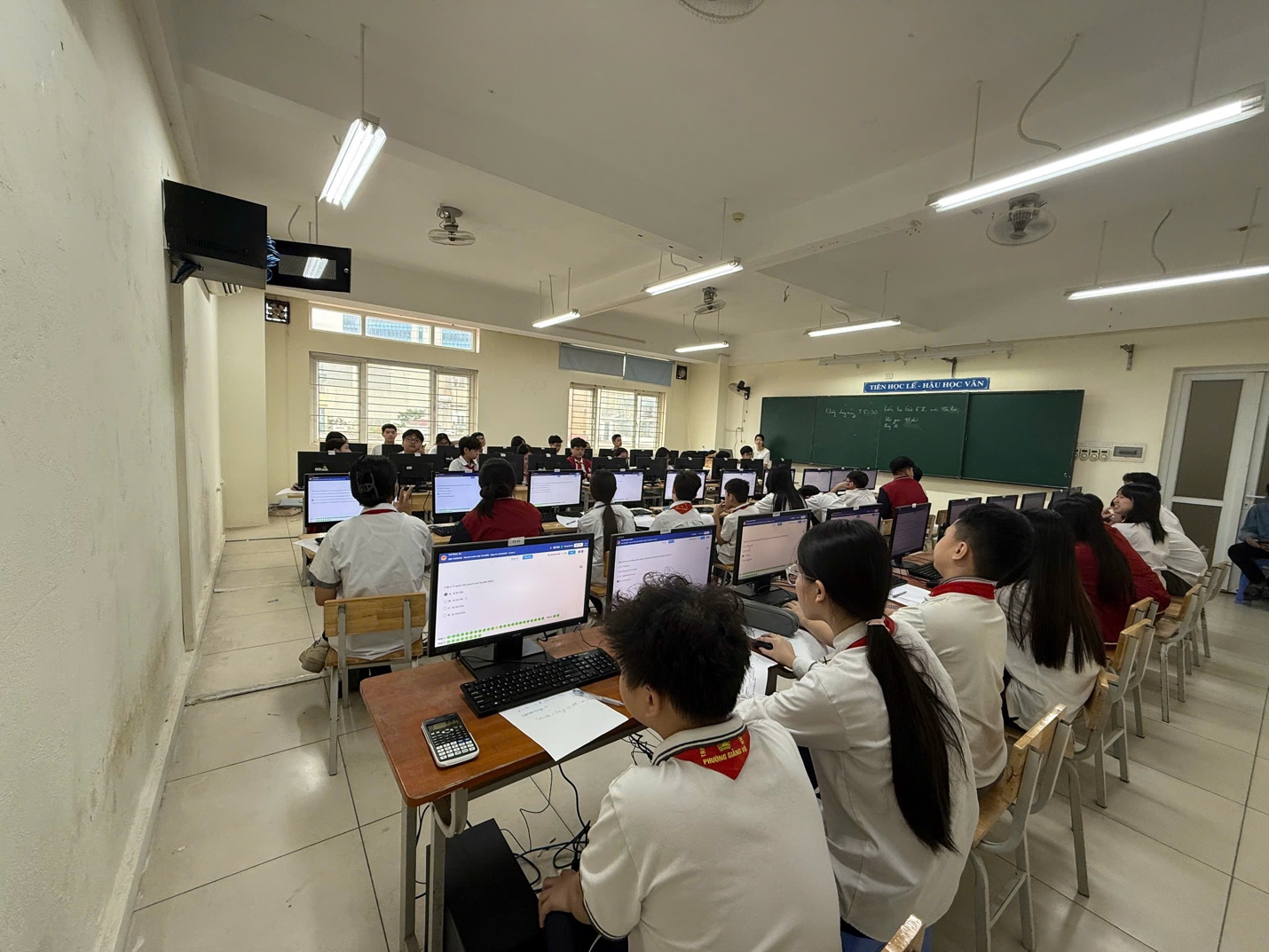Công tác tổ chức được thực hiện nghiêm túc với sự tham gia của giám thị chính và giám thị hỗ trợ tại từng phòng thi. Việc giám sát được tiến hành chặt chẽ, đảm bảo tính công bằng của kỳ kiểm tra. Các thầy cô không chỉ làm nhiệm vụ coi thi mà còn hỗ trợ kỹ thuật kịp thời khi cần thiết, giúp học sinh yên tâm hoàn thành bài làm.