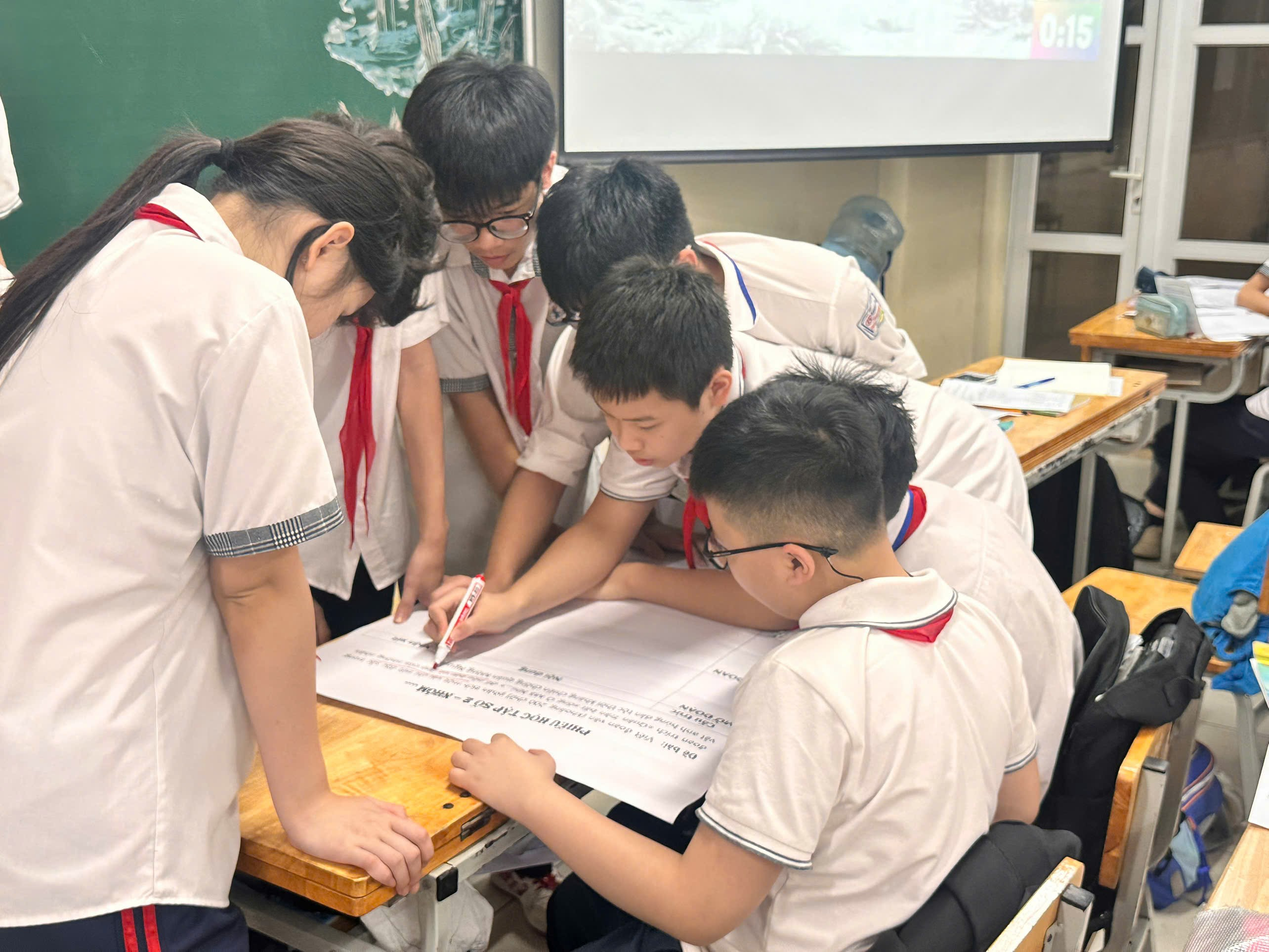 Ở phần Tập làm văn, cô giáo tổ chức cho học sinh luyện tập viết đoạn văn thông qua các hoạt động thảo luận nhóm, xây dựng dàn ý cho từng dạng đề. Qua đó, học sinh được rèn luyện kỹ năng diễn đạt, lập luận và triển khai ý mạch lạc, rõ ràng.