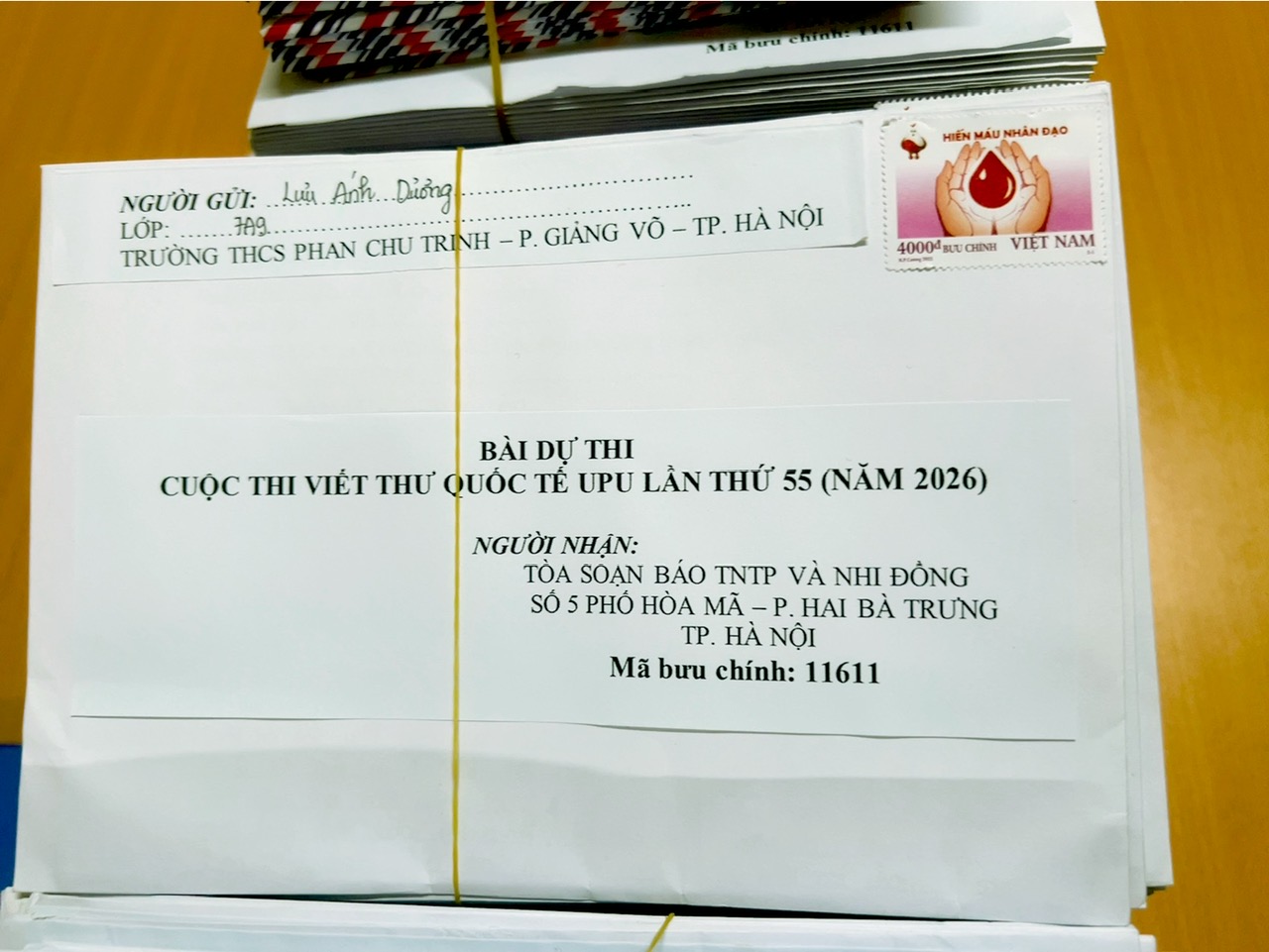 Cận cảnh những bức thư được dán tem "Hiến máu nhân đạo" đầy ý nghĩa, mang theo tâm huyết của các bạn học sinh lớp 7A3, 7A9...