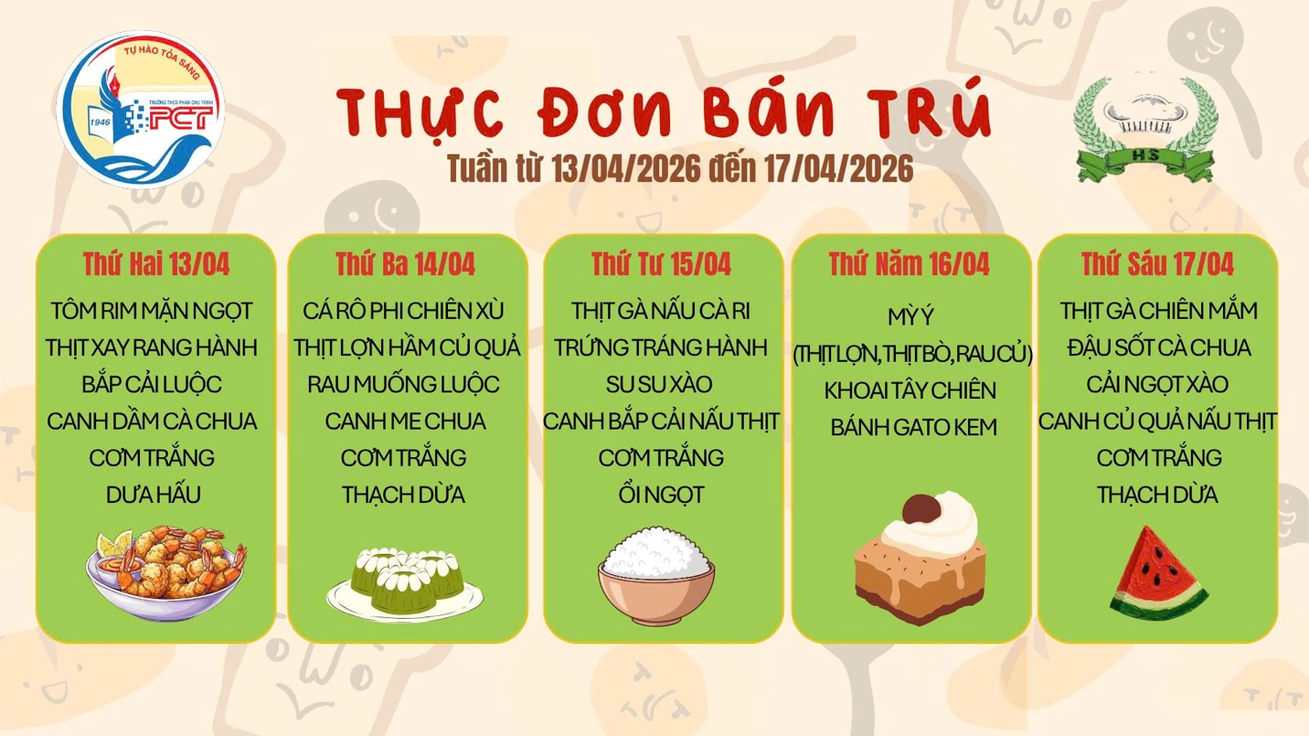 Thực đơn bán trú từ ngày 13/04/2026 đến 17/04/2026