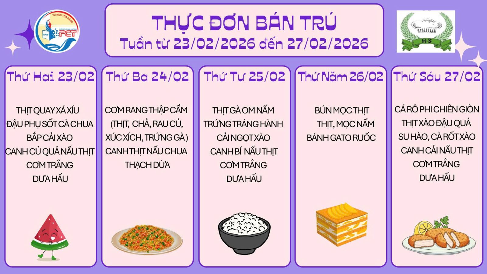 Thực đơn bán trú từ ngày 23 đến 27/2/2026