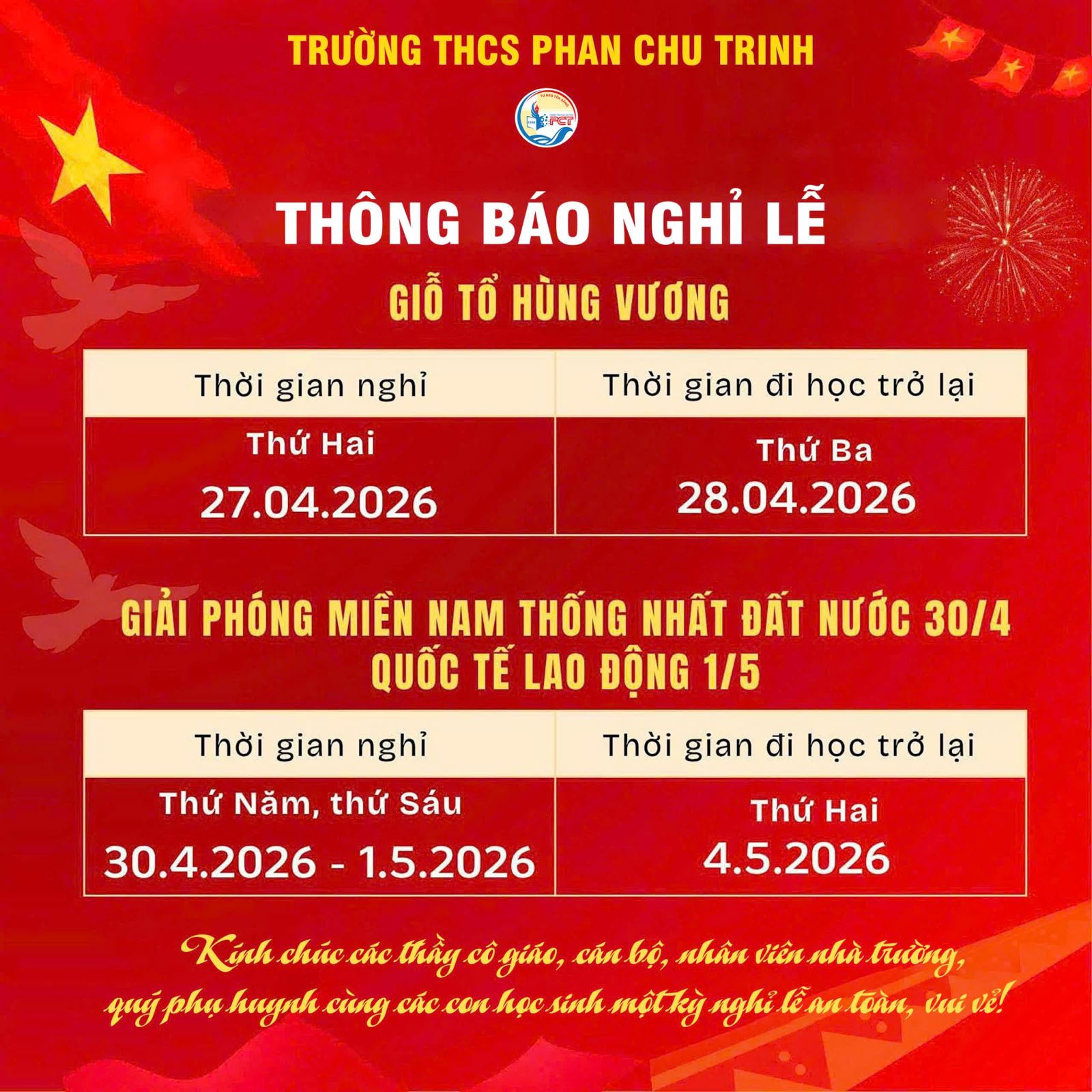 Trường THCS Phan Chu Trinh thông báo lịch nghỉ lễ