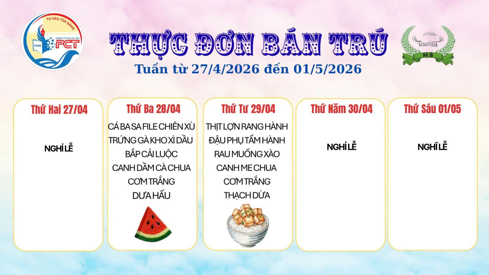 Thực đơn bán trú từ ngày 20/4 đến 24/4/2026 của Trường THCS Phan Chu Trinh