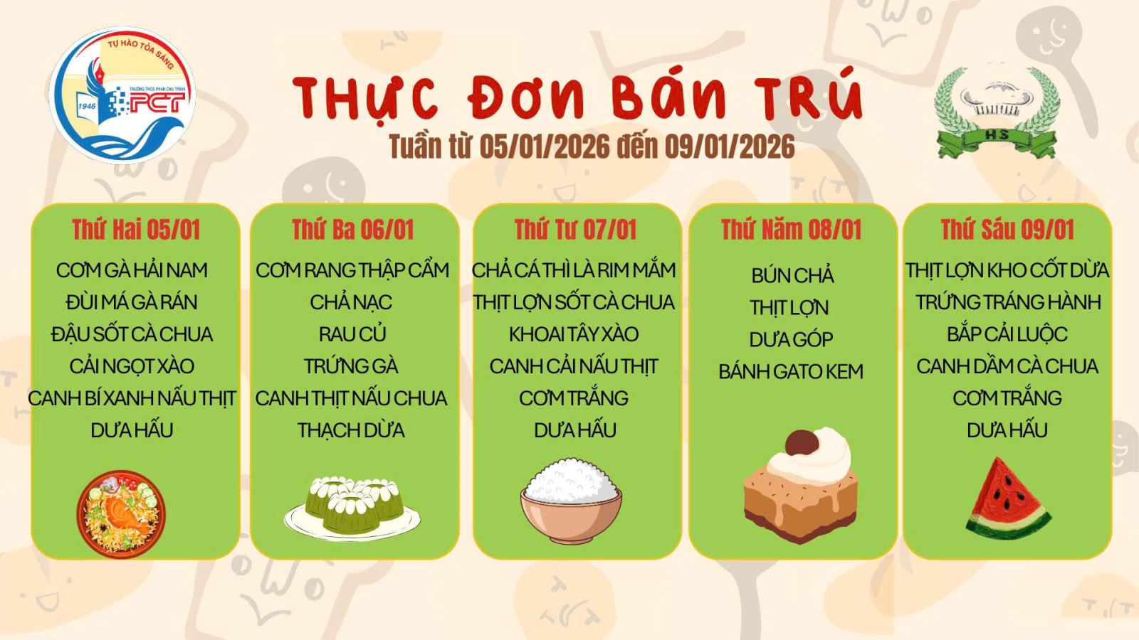 Thực đơn bán trú từ ngày 05/01 đến 09/01/2026